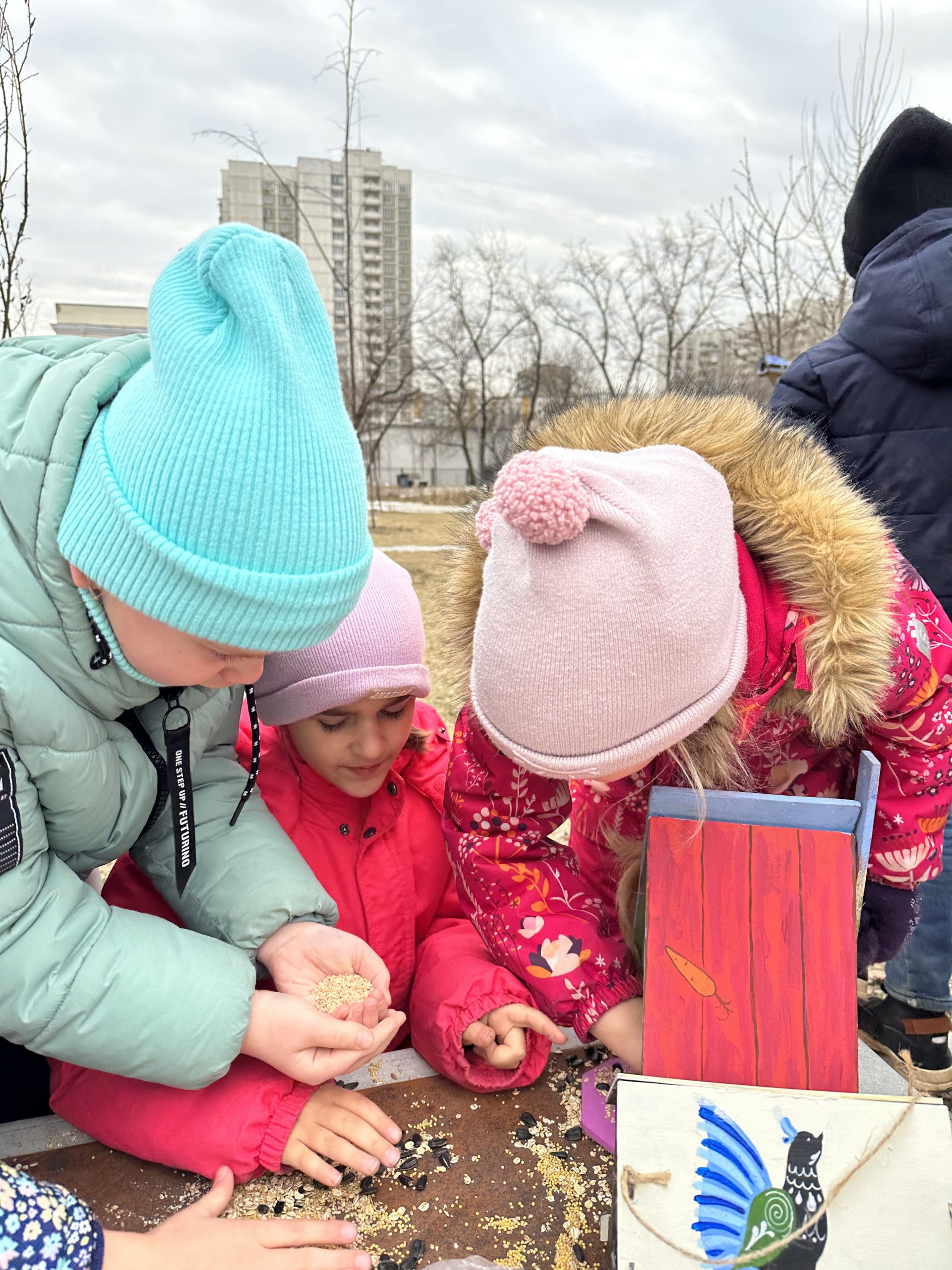 Для этого ребята дизайнерского факультета и родители второклассников изготовили более 20 уникальных всепогодных кормушек для птиц и с помощью старосты храма — Вадима Евгеньевича Мерзликина ребята общими усилиями закрепили их на самых высоких деревьях сквера, перед этим наполнив их доверха самым разнообразным и вкусным кормом.