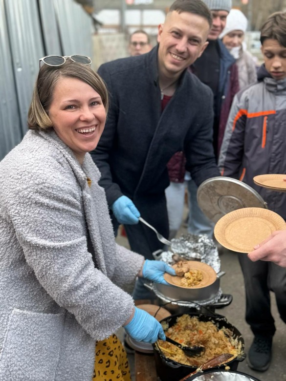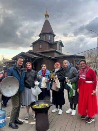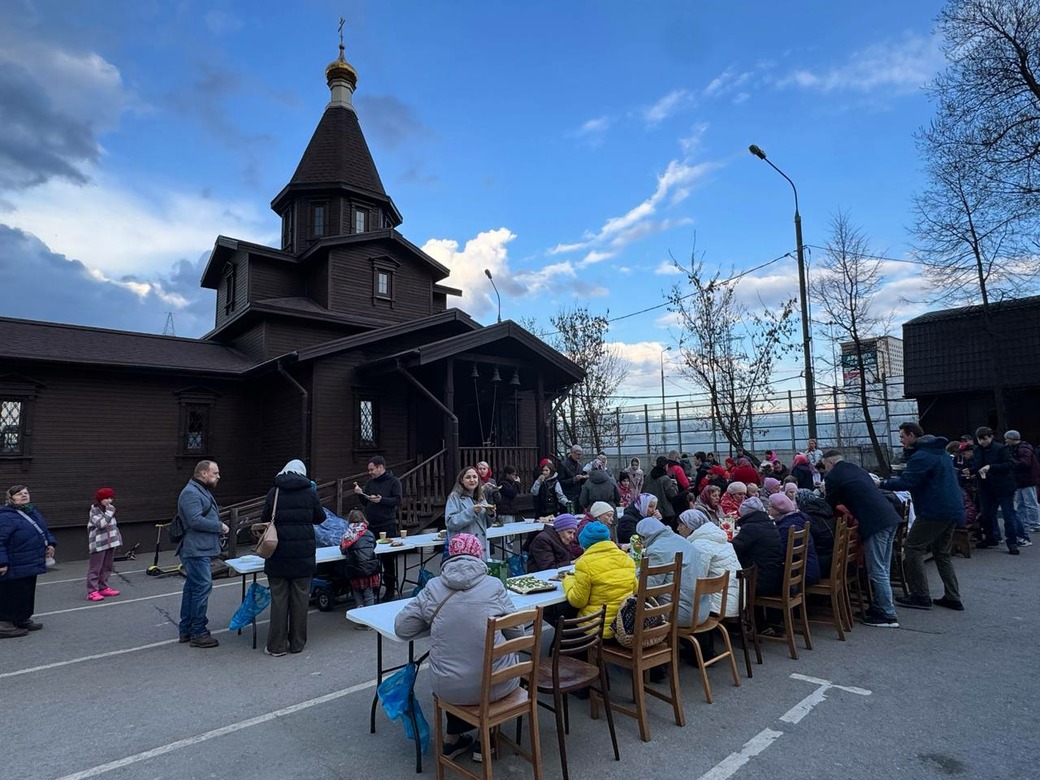 Затем и.о. настоятеля храма иерей Димитрий Савенков пригласил всех за общий стол. Где гостей ждали ароматные шашлыки, плов, шурпа и другие вкусные угощения. За трапезой прихожане делились друг с другом пасхальной радостью, а после пустились в пляс.