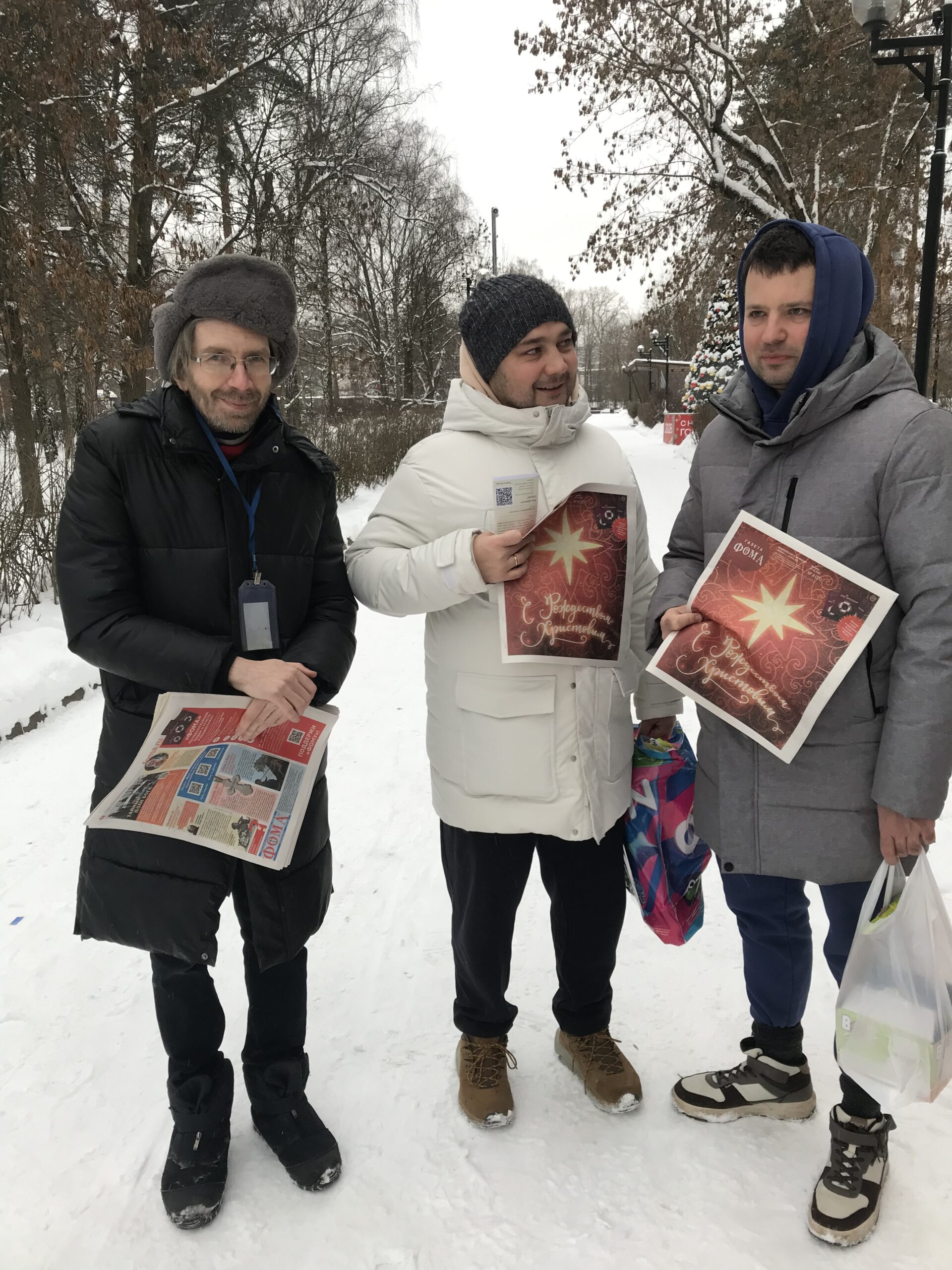 При праздничном поздравлении всем желающим раздавался специальный номер газеты «Фома», посвященный празднику Рождества Христова и буклет, разработанный Синодальным миссионерским отделом Северо-Восточного викариатства. При раздаче просветительских материалов добровольцы приглашали посетить храм, занятия и беседы, проводимые во взрослой воскресной школе.