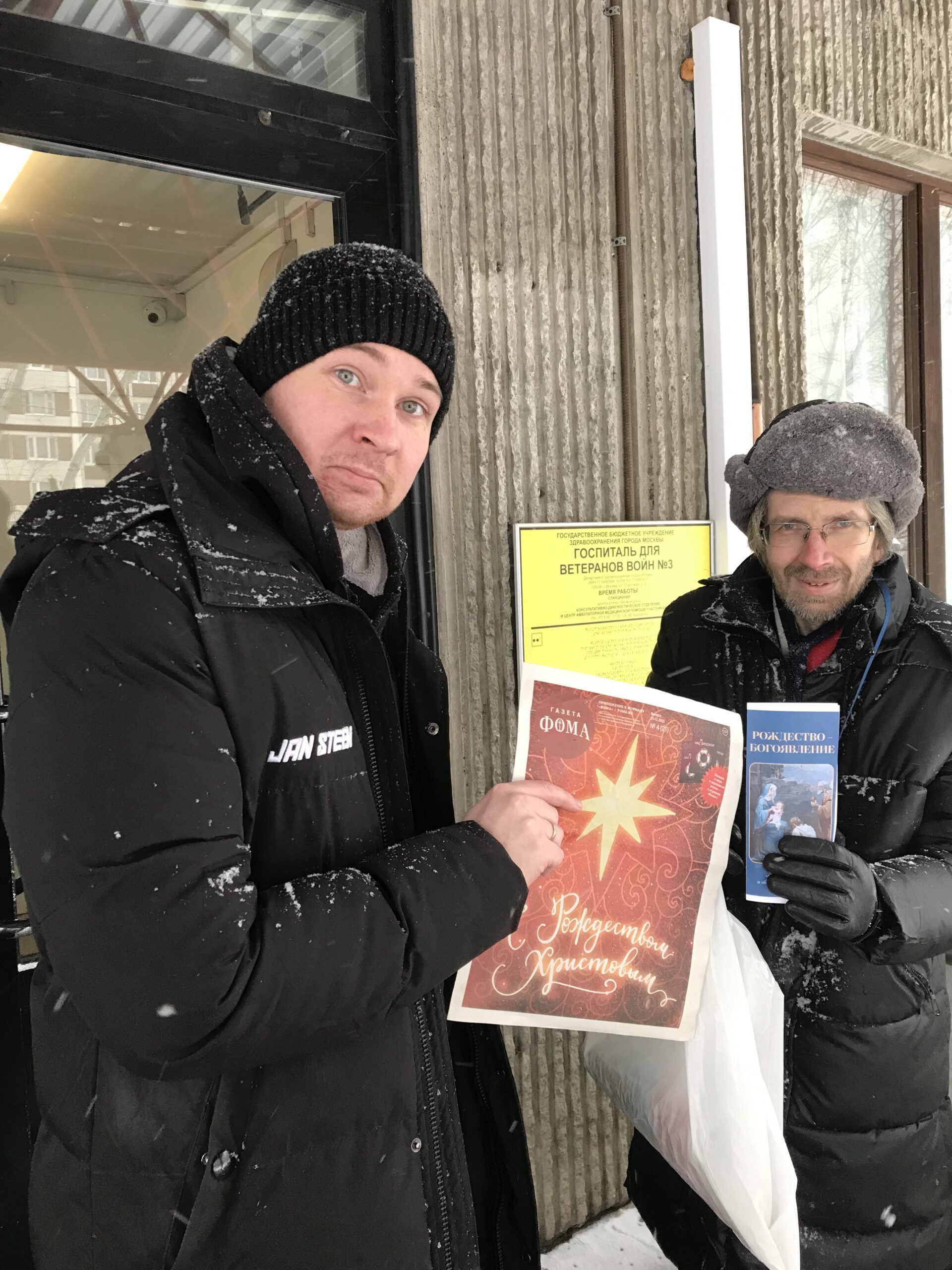 В этот же день состоялось праздничное поздравление с Рождеством Христовым раненых бойцов в Госпитале для ветеранов войн №3 в ходе которого желающим также раздавался специальный номер газеты «Фома».