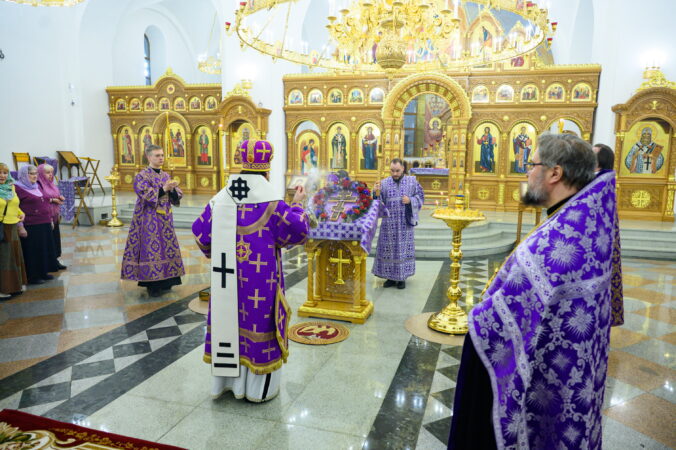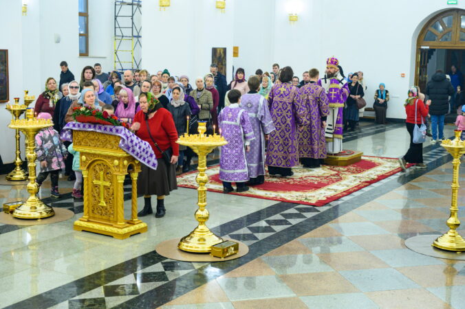 На утрене после пения Великого славословия архипастырь совершил чин выноса Креста Господня.