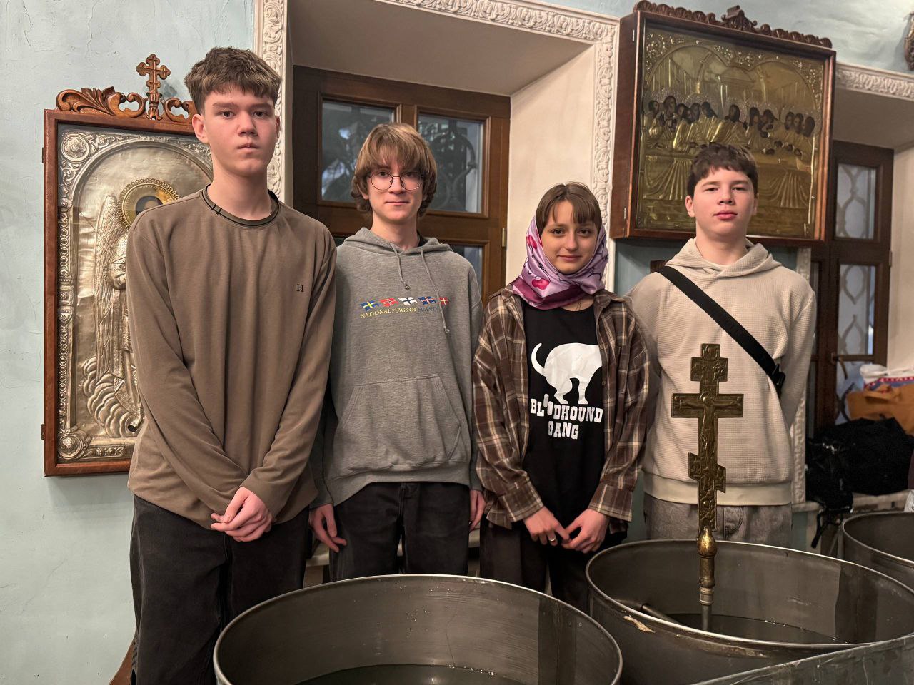 Ребята и девчонки во главе с руководителем подросткового клуба Виолеттой Борисовной Максимовой собрались к окончанию рабочего дня, чтобы встретить жителей района, пришедших в храм за святой водой и рассказать им о смысле праздника в интерактивной форме.