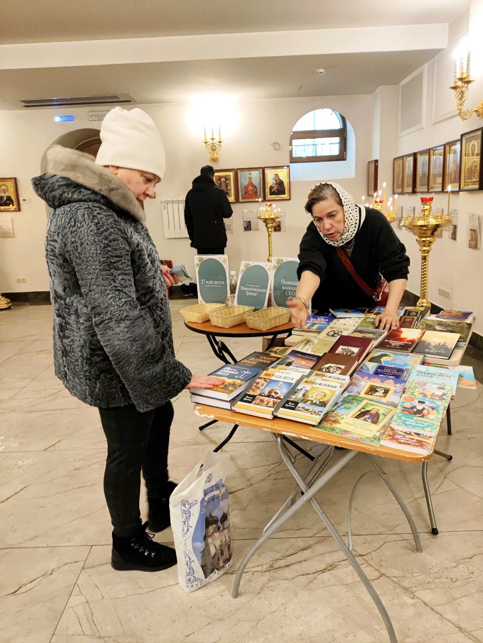 В праздничные дни Крещения Господня в храме на Лосинке прошла необычная благотворительная книжная ярмарка. Книги на любой вкус — от духовных наставлений до жития святых. Мероприятие собрало много людей, которые пришли не только за крещенской водой, но и за православной литературой, общением с духовенством, за поддержкой и добрым словом. Среди посетителей были не только прихожане, но и простые православные люди, которые посещают храмы только по большим праздникам.
