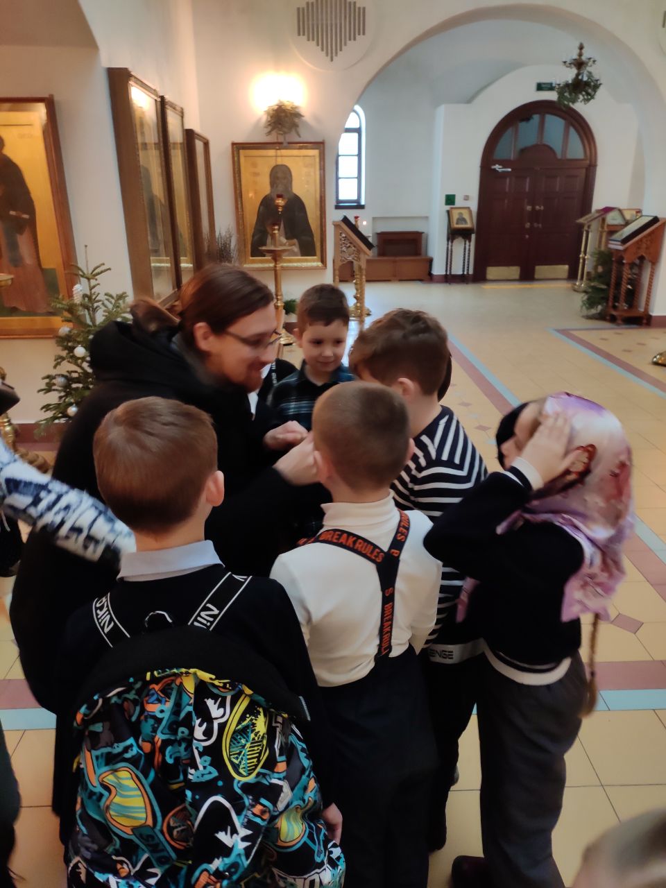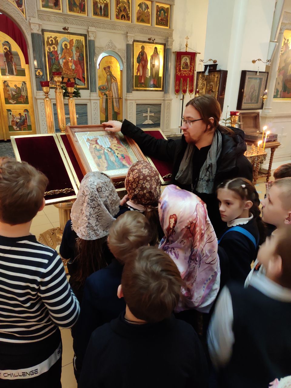 Школьники узнали о событиях, связанных с рождением Иисуса Христа, познакомились с житиями святителя Николая Чудотворца, преподобного Сергия Радонежского и Иоанна Предтечи. Также им рассказали о смысле и традициях праздника Крещения Господня. Ребята научились правильно ставить свечи перед иконами и пили святую крещенскую воду.