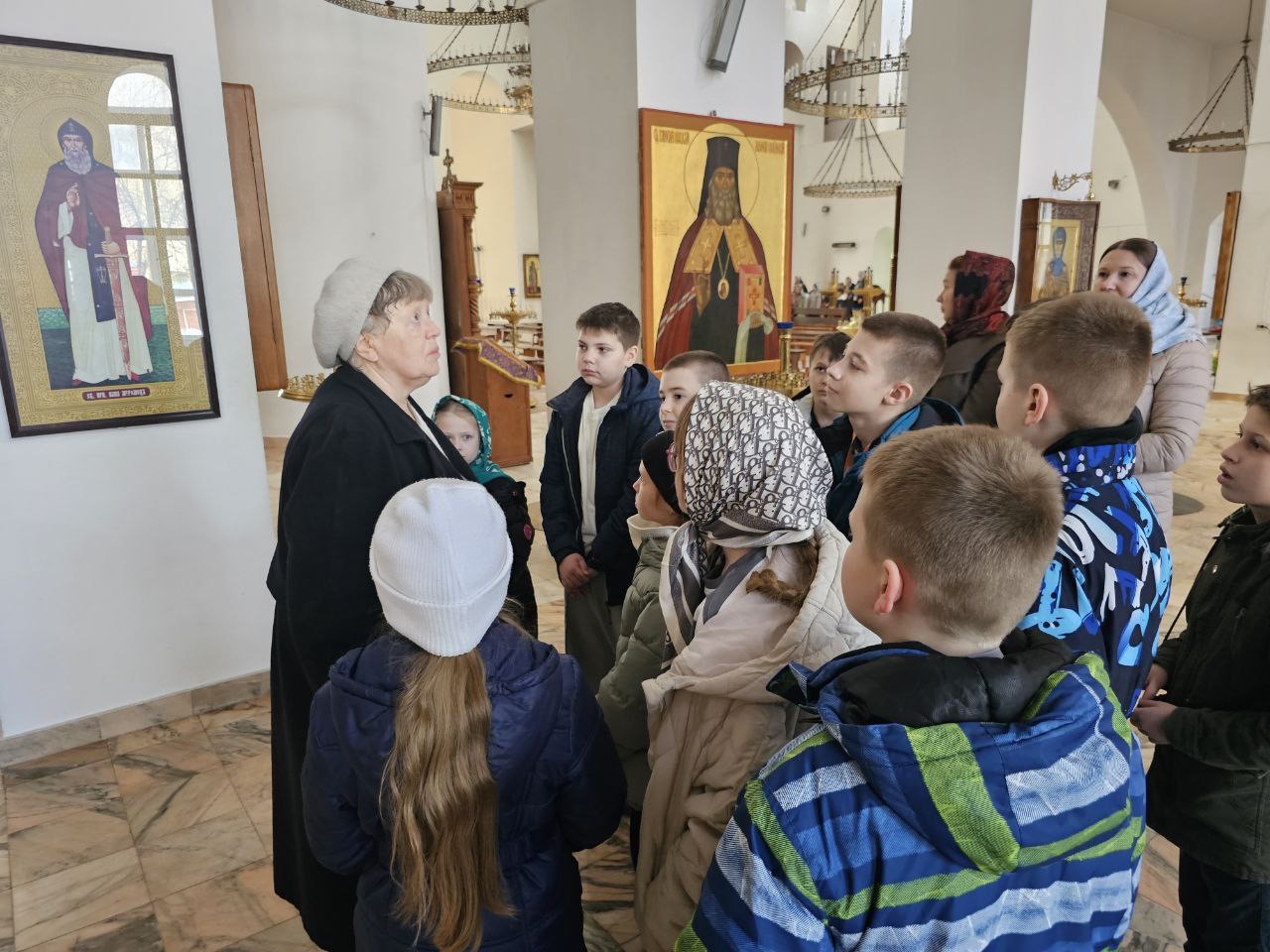 Дети посетили два храма прихода – храм преподобного Сергия Радонежского XIX века и просторный храм Собора Московских святых, узнали об истории прихода, познакомились с житиями преподобного Сергия Радонежского и святого равноапостольного Николая Японского, блаженной Матроны Московской.