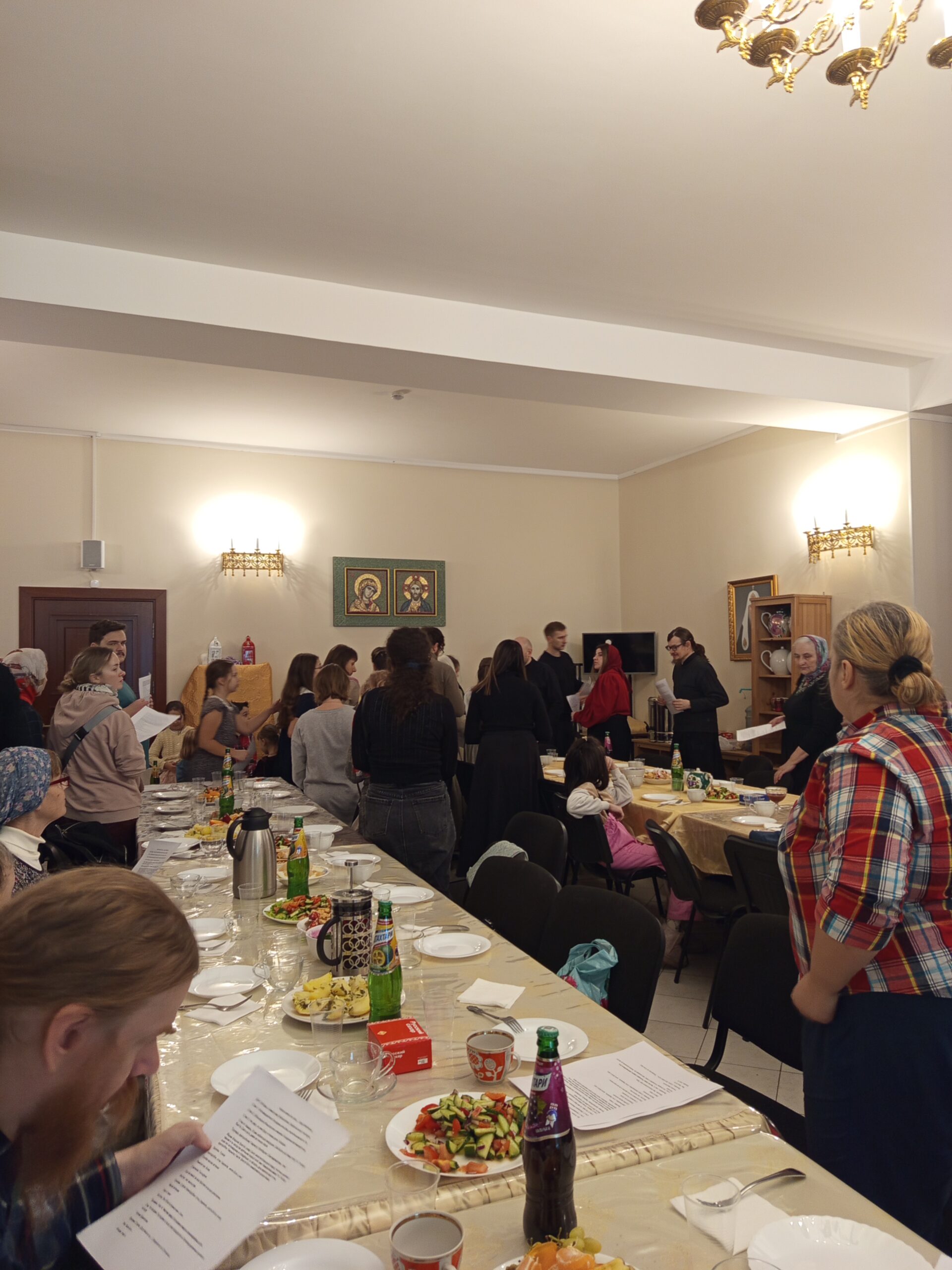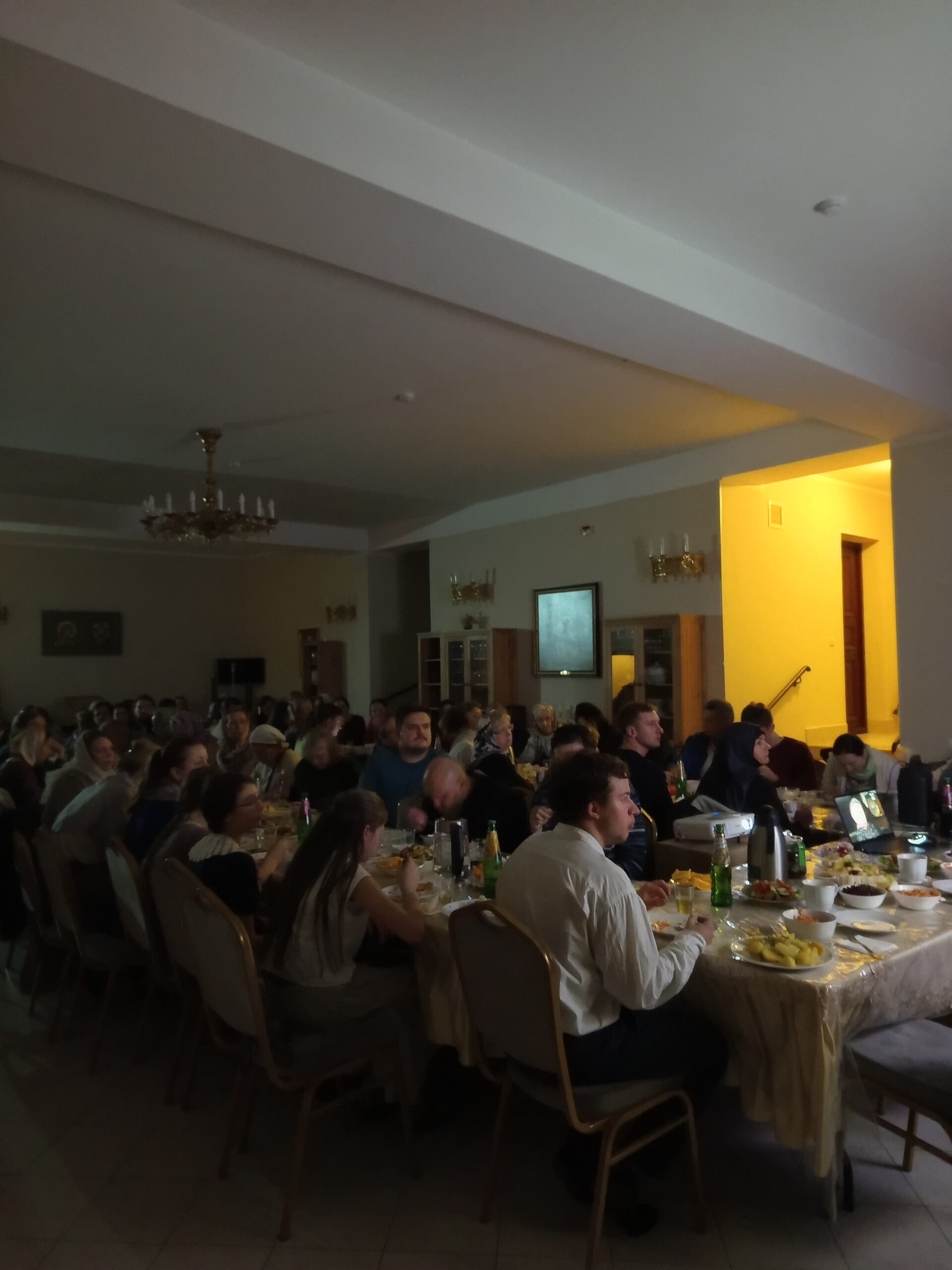 Затем присутствующие, во время организованной прихожанами трапезы с блюдами грузинской кухни, приготовленными на средства, собранные участниками, посмотрели документальный фильма о преподобном отце Гаврииле.