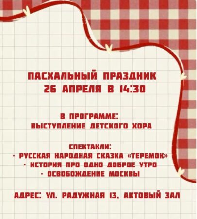 26 апреля 2026 года в 14:30 в воскресной школе храма Положения Ризы Пресвятой Богородицы во Влахерне, в Леонове (ул. Радужная, 13 (актовый зал)) состоится большой пасхальный праздник.