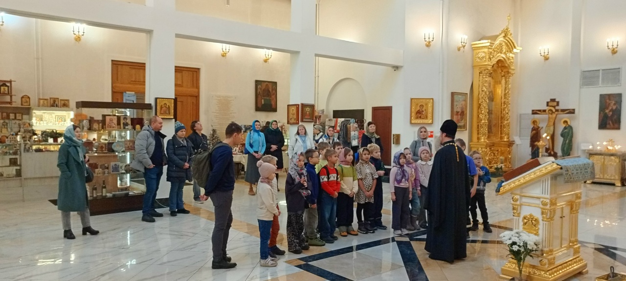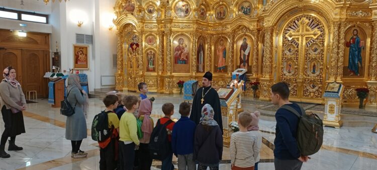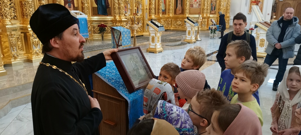 Знакомство началось с экскурсии. И.о. настоятеля храма иерей Александр Бриленков рассказал ребятам о Боге, Пресвятой Богородице и святых, изображенных на иконах, об истории, устройстве храма и православных праздниках. Дети задавали вопросы, им все было интересно.