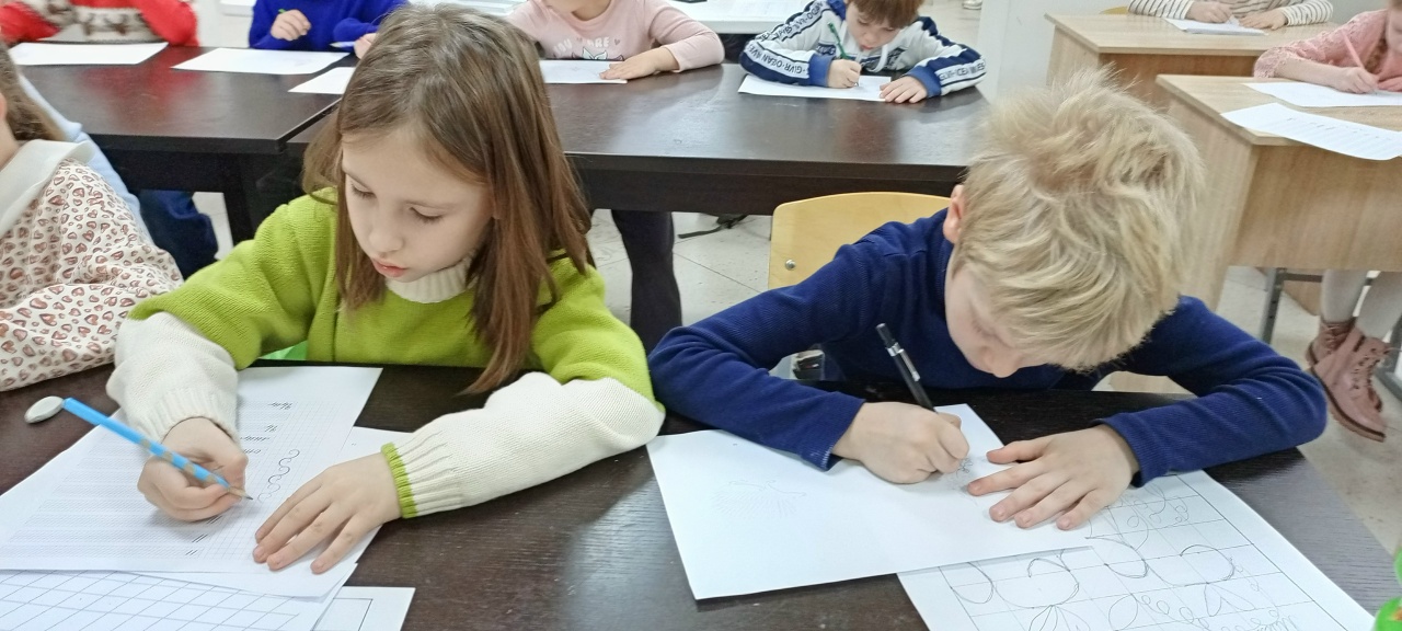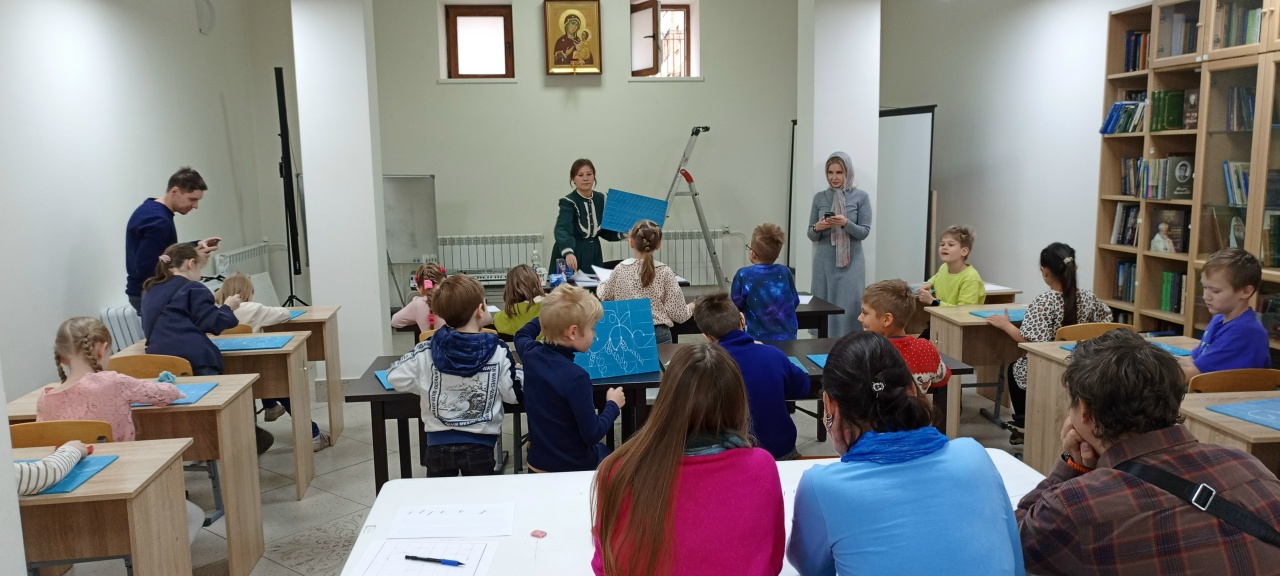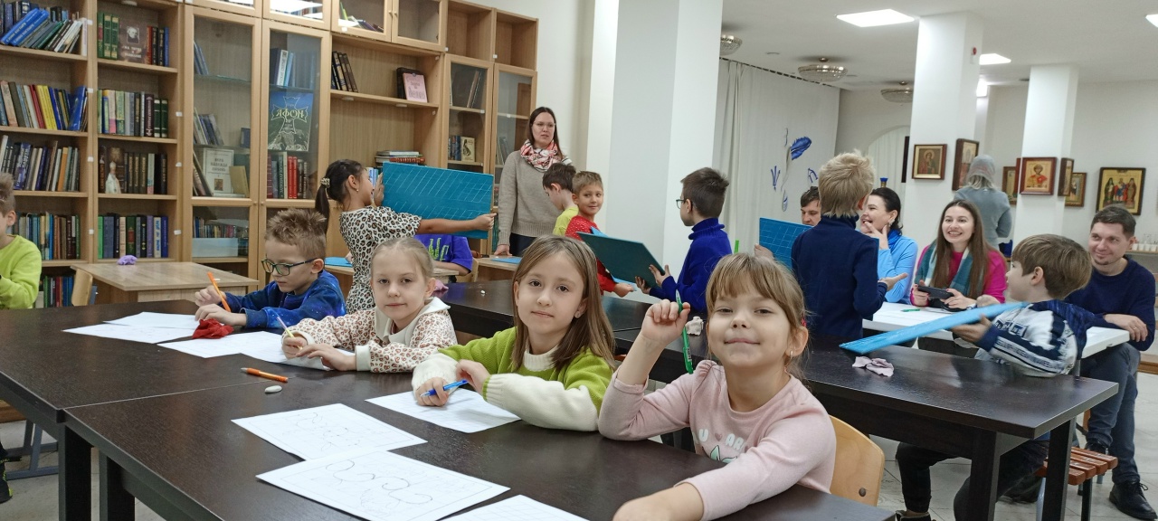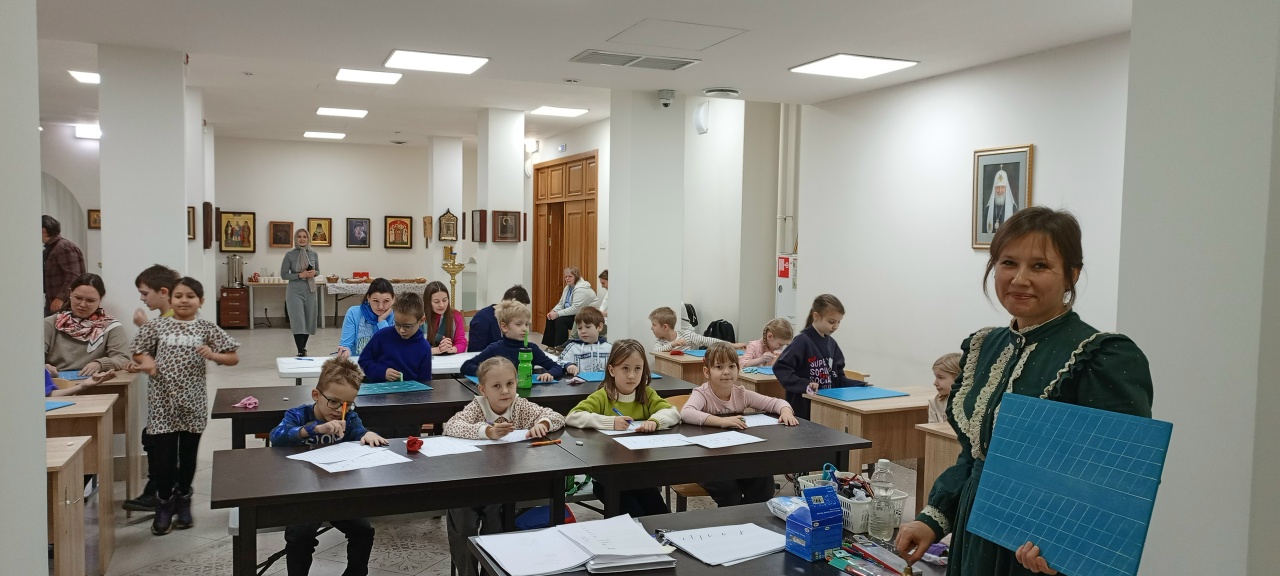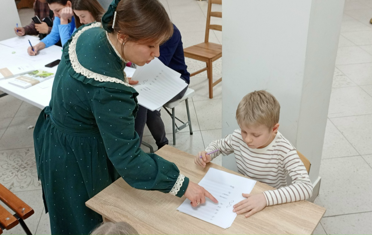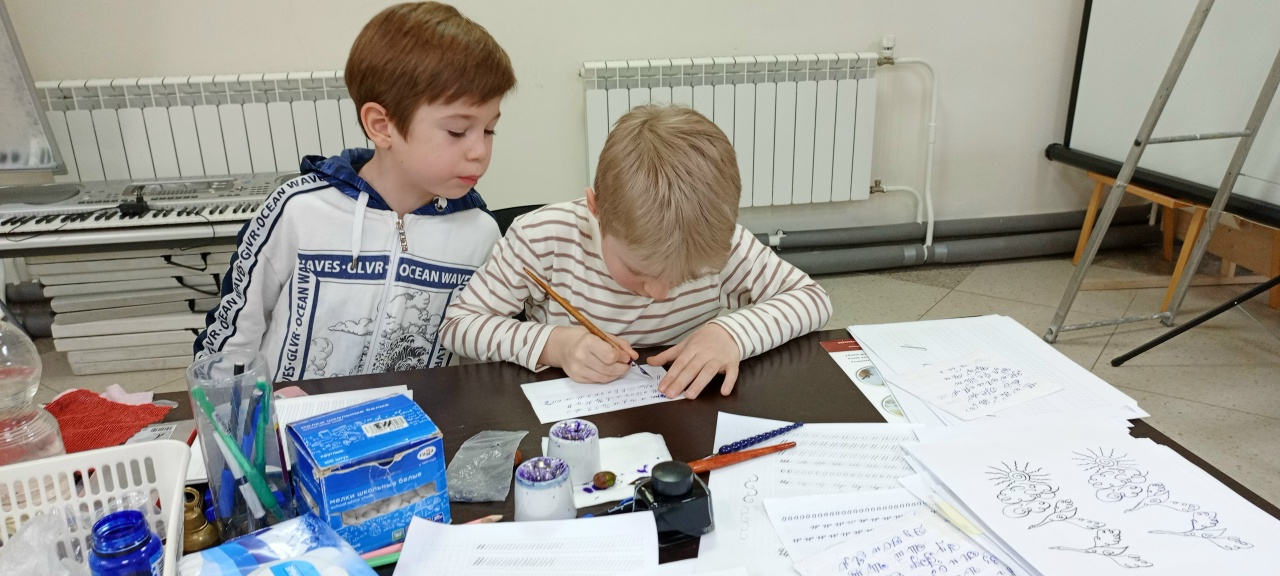 Затем педагог воскресной школы Елена Вадимовна Гвоздева провела для детей урок каллиграфии. На занятии они писали мелками на деревянных досках, карандашами обводили орнаменты, а после — перьями выводили чернилами красивые буквы на особой бумаге с разлиновкой.