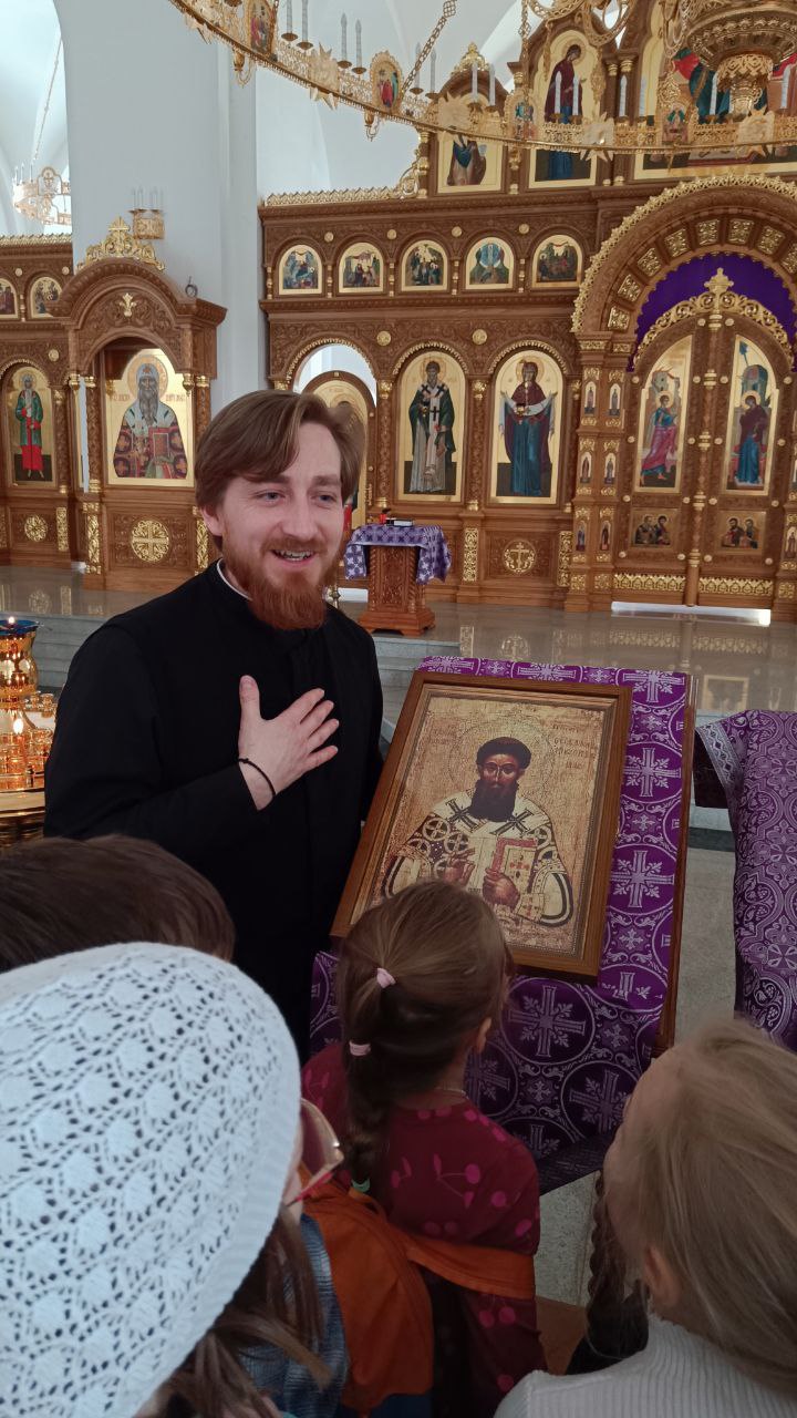Сотрудник храма чтец Александр Зиновьев, в увлекательной беседе рассказал, что такое тетрапод и где обычно встречают архиерея, как называется место, с которого священник читает проповедь и почему в храме так много икон.