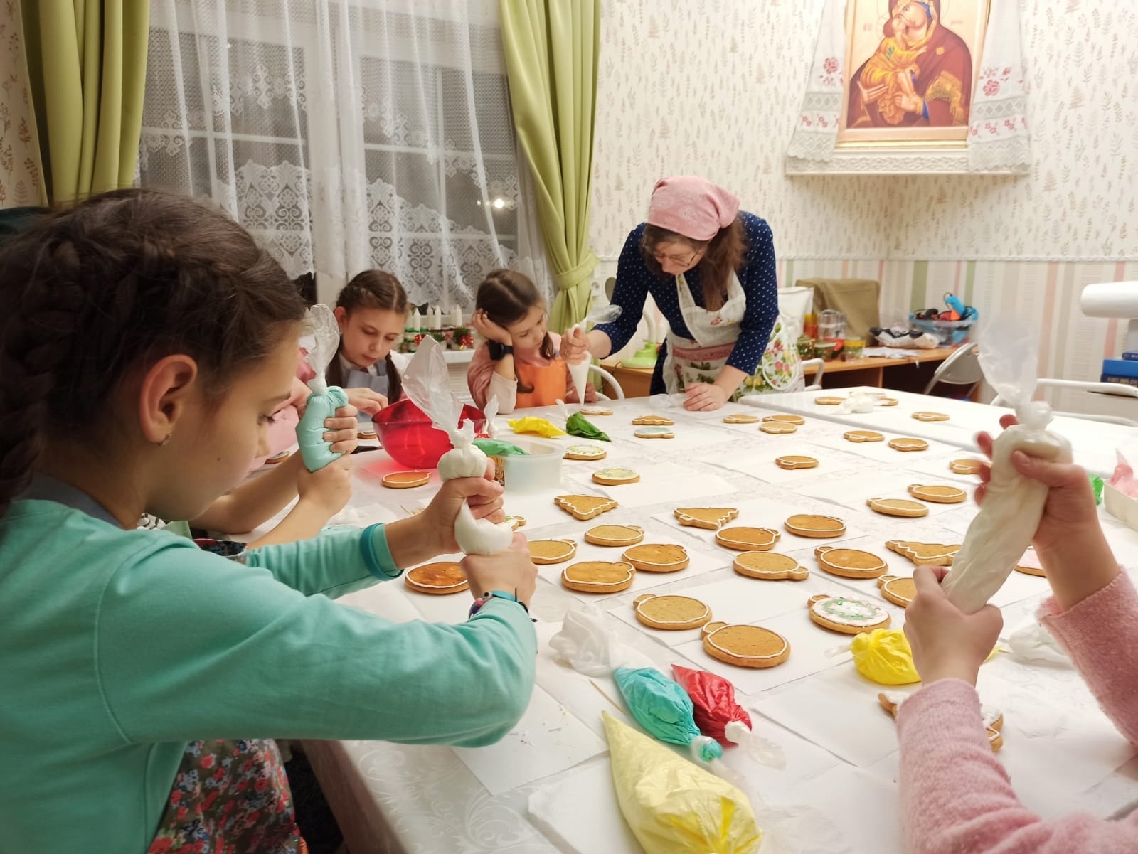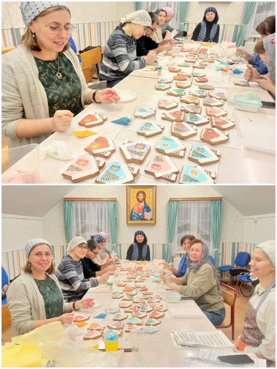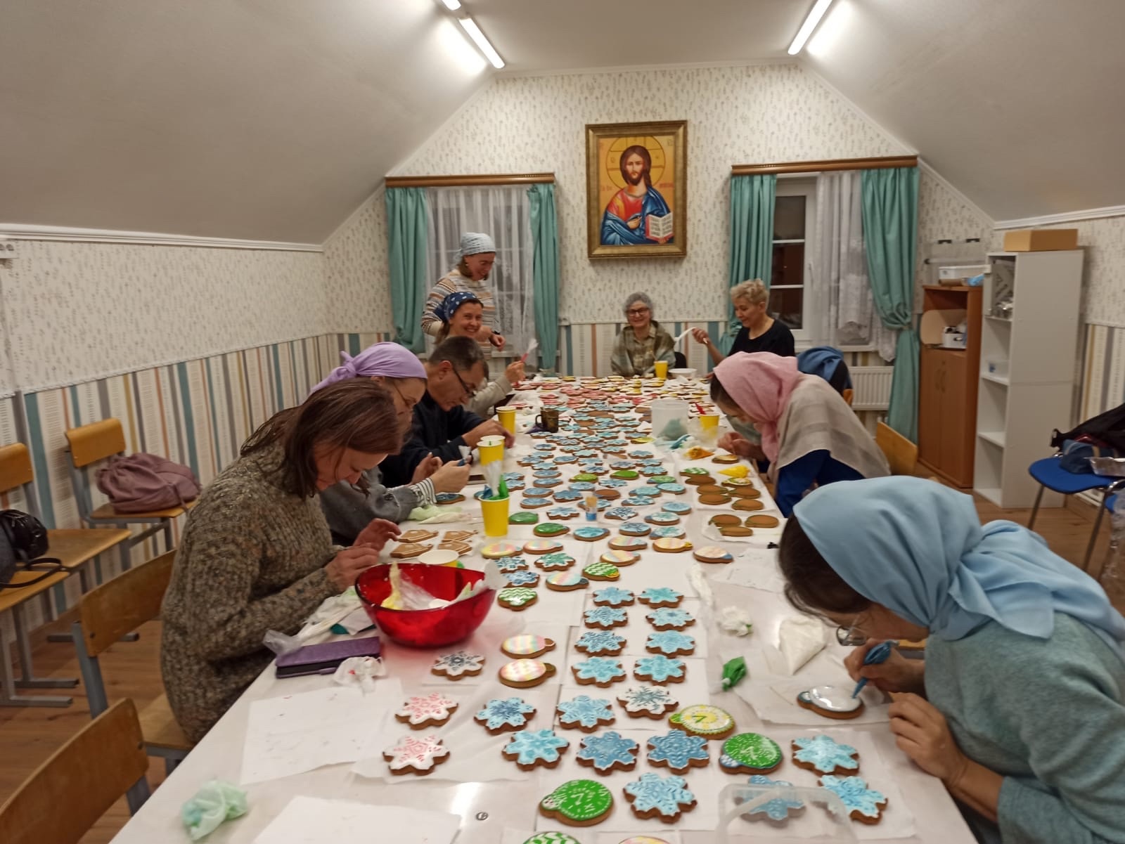 Под руководством Ирины Зенкиной прихожанки «Семейного клуба», а также старшие и младшие девочки из воскресной школы изготавливают и расписывают пряники. Это будут рождественские подарки, которые пойдут на благотворительность в разные социальные места, окормляемые священниками храма. Большая часть из них будет отправлена в военный госпиталь.