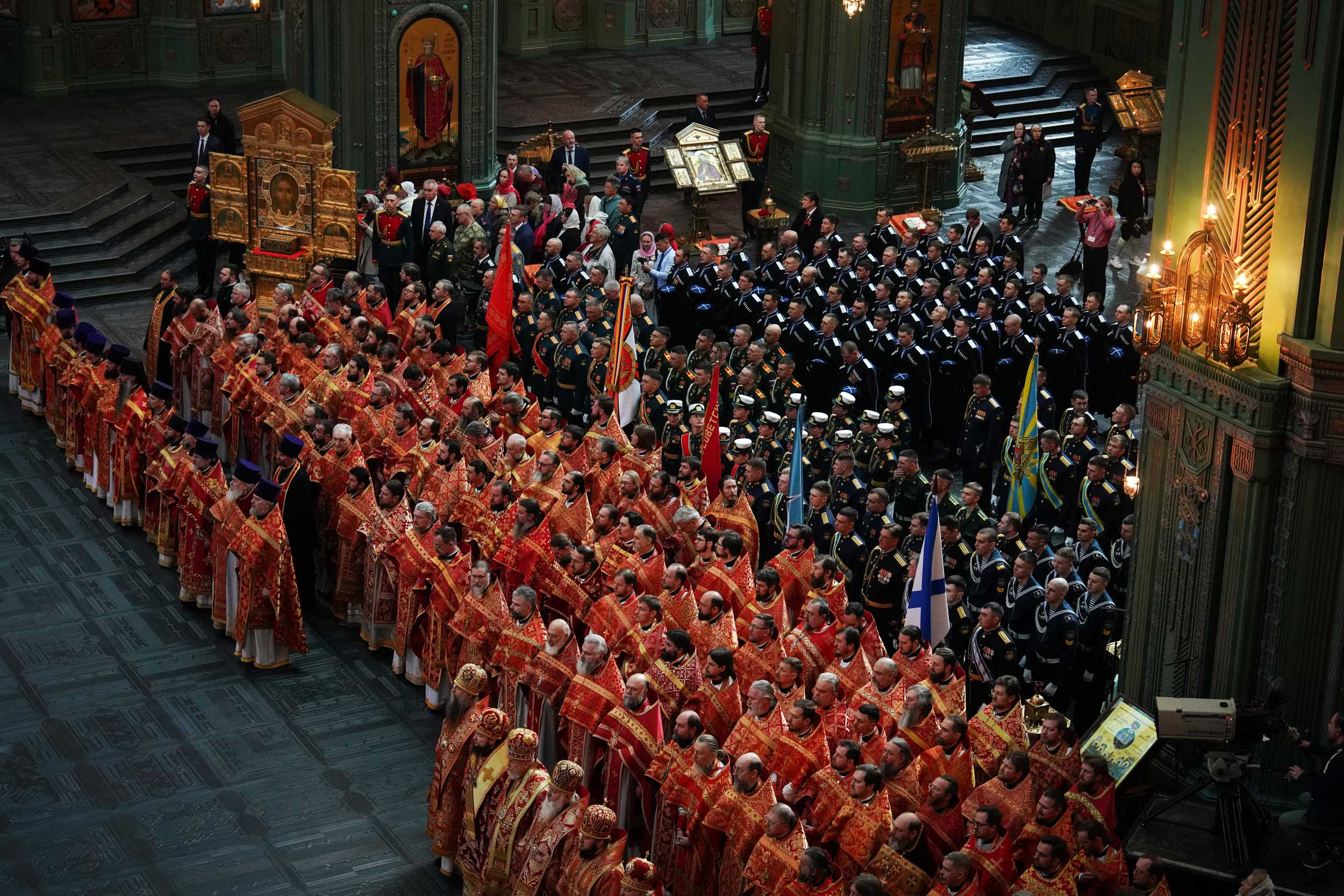 Его Святейшеству сослужили сонм архиереев Русской Православной Церкви, в числе которых был управляющий Северо-Восточным Московским викариатством митрополит Звенигородский Арсений, а также военное духовенство Русской Православной Церкви, благочинные и духовенство г. Москвы и Московской митрополии — всего более 300 священнослужителей.