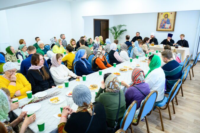 После Литургии уже традиционно прихожане были приглашены на чаепитие с угощениями, за которым любой желающий мог пообщаться с владыкой Арсением и духовенством храма.