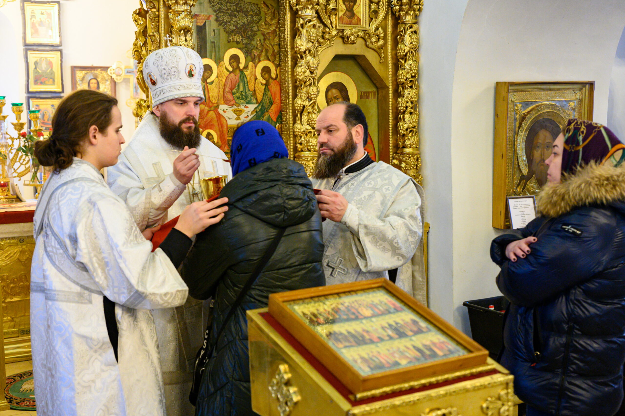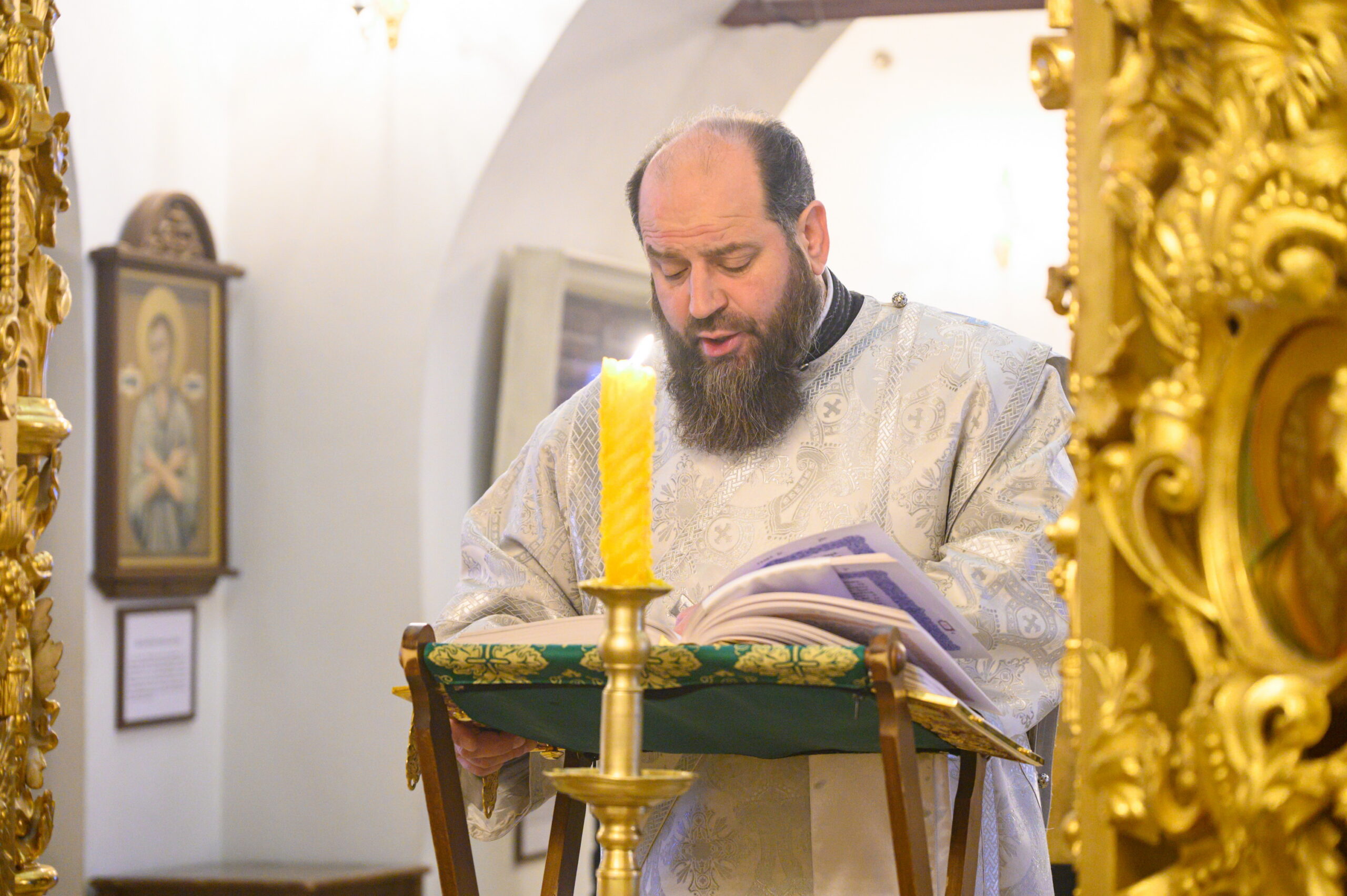 Его Высокопреосвященству сослужили клирик храма — иерей Павел Ефремов, а также клирик храма Тихвинской иконы Божией Матери, Патриаршего подворья в Алексеевском протодиакон Василий Куфлик.
