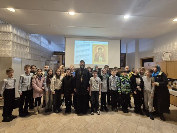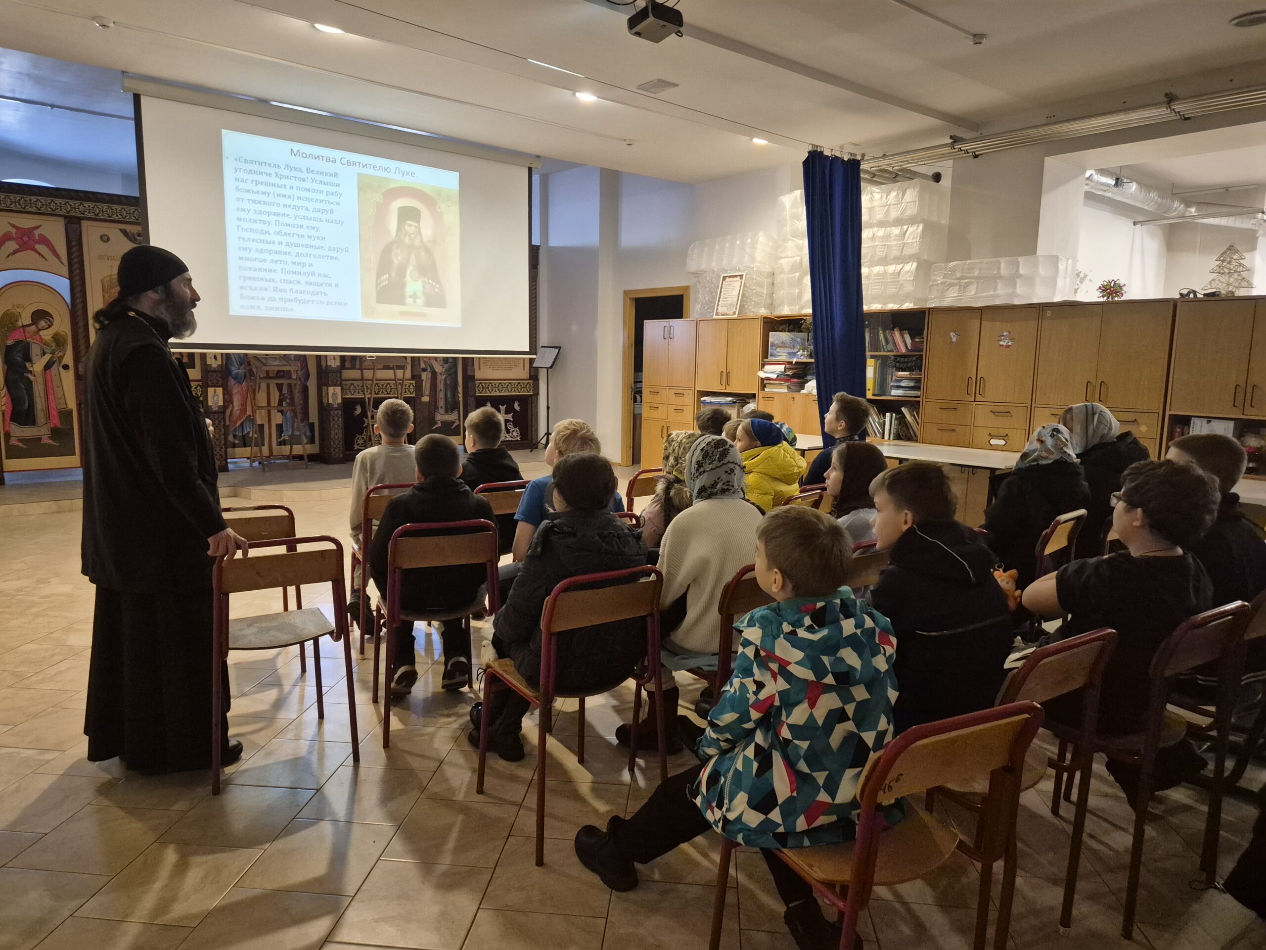Темой новой встречи стали иконы. Сначала для детей провели экскурсию по храму, познакомили их с его устройством и рассказали о наиболее почитаемых иконах. Затем школьники посмотрели документальный фильм о святителе Луке (Войно-Ясенецком).