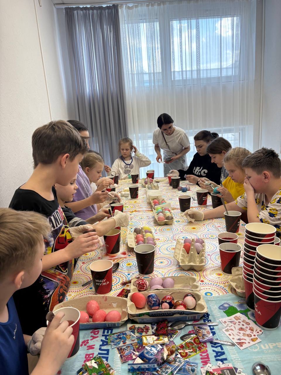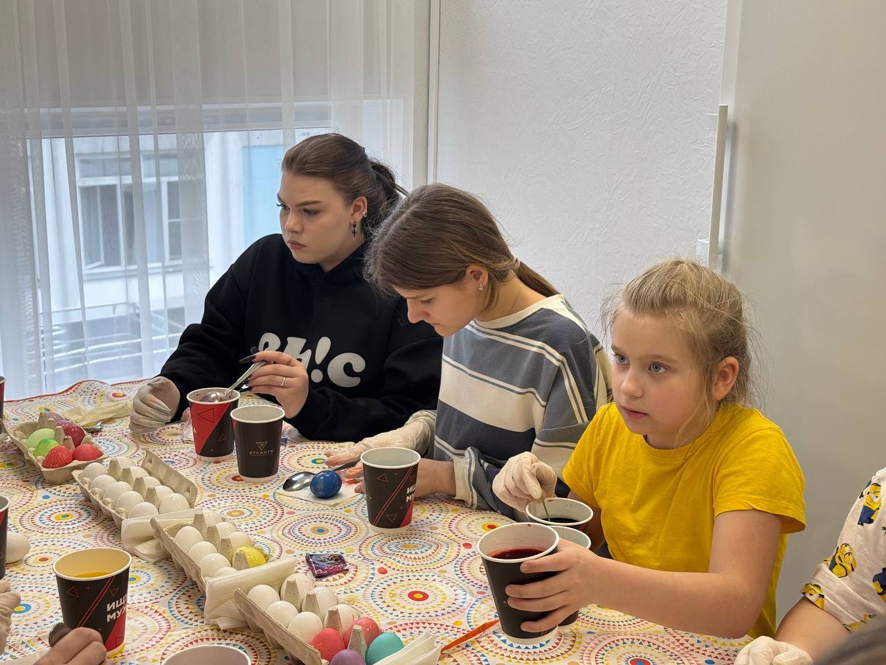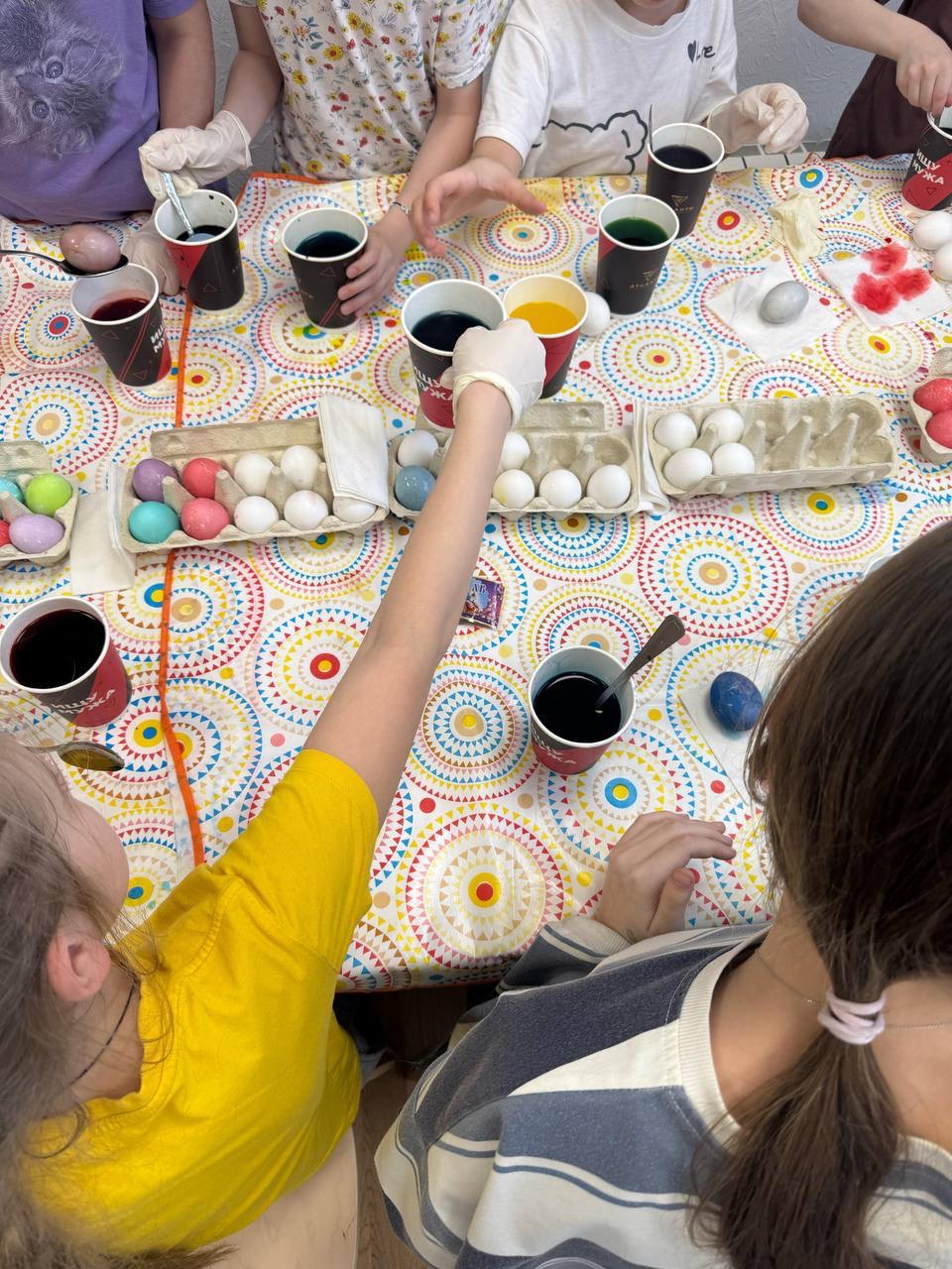 Ребята вместе с воспитанниками покрасили яйца к предстоящему празднику Пасхи.