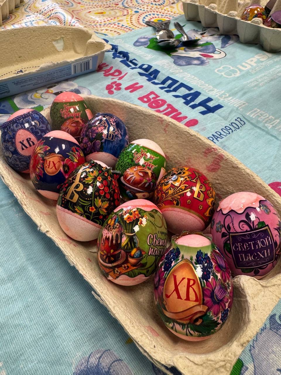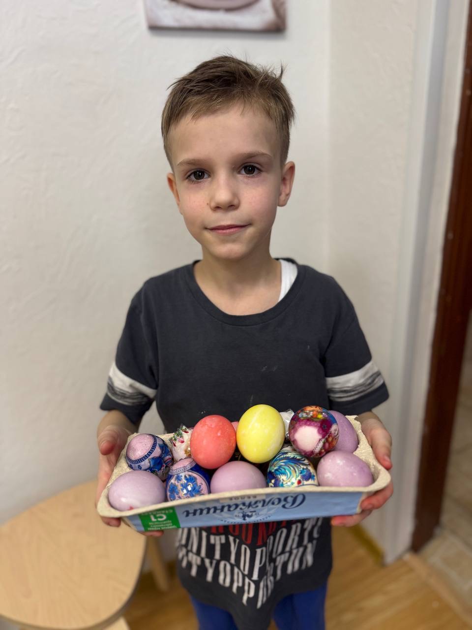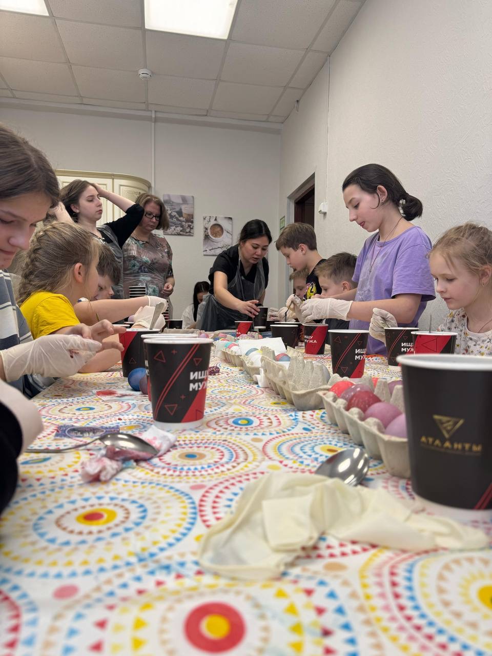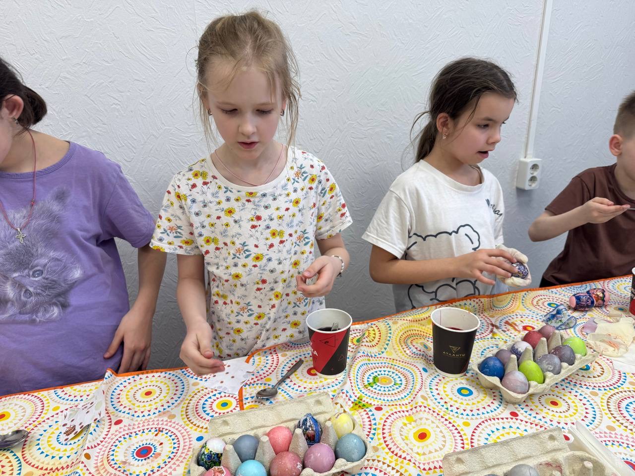 Ребята вместе с воспитанниками покрасили яйца к предстоящему празднику Пасхи.