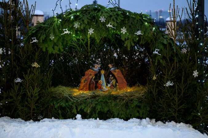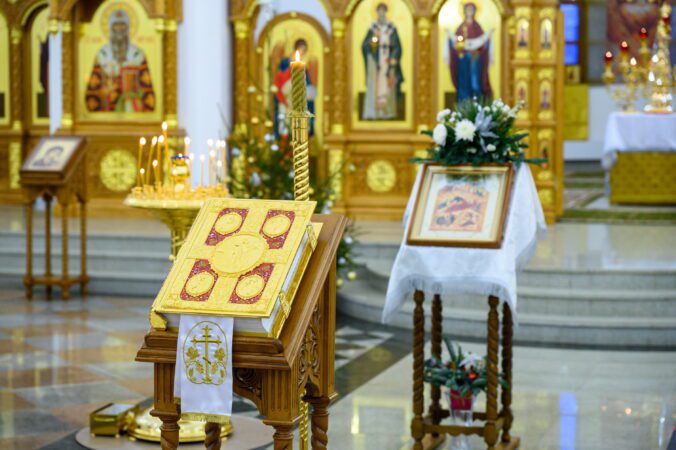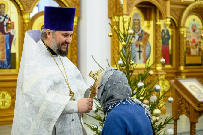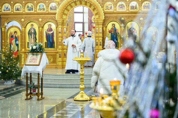 После отпуста Литургии перед праздничной иконой духовенство во главе с архипастырем исполнили тропарь и кондак праздника Рождества Христова.