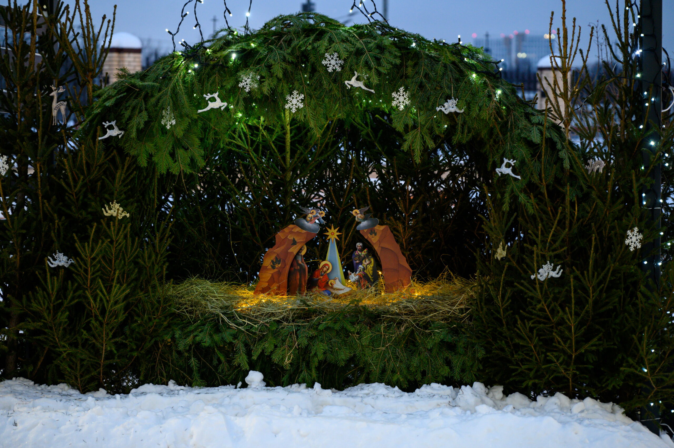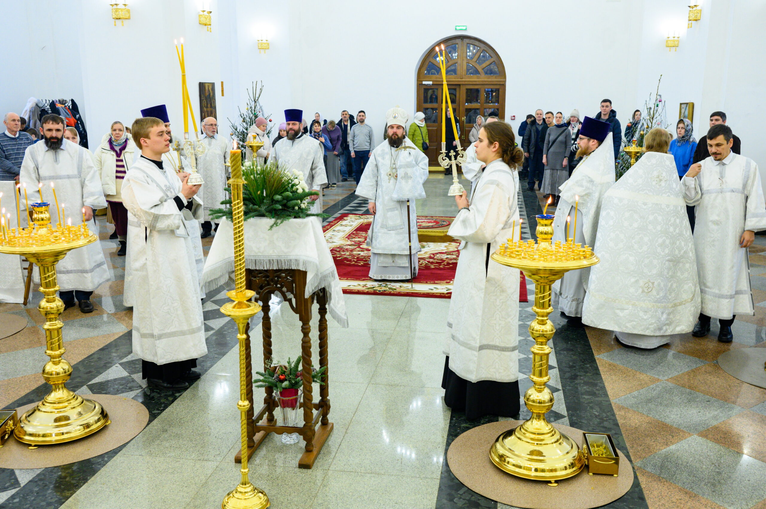 После отпуста Литургии перед праздничной иконой духовенство во главе с архипастырем исполнили тропарь и кондак праздника Рождества Христова.