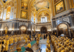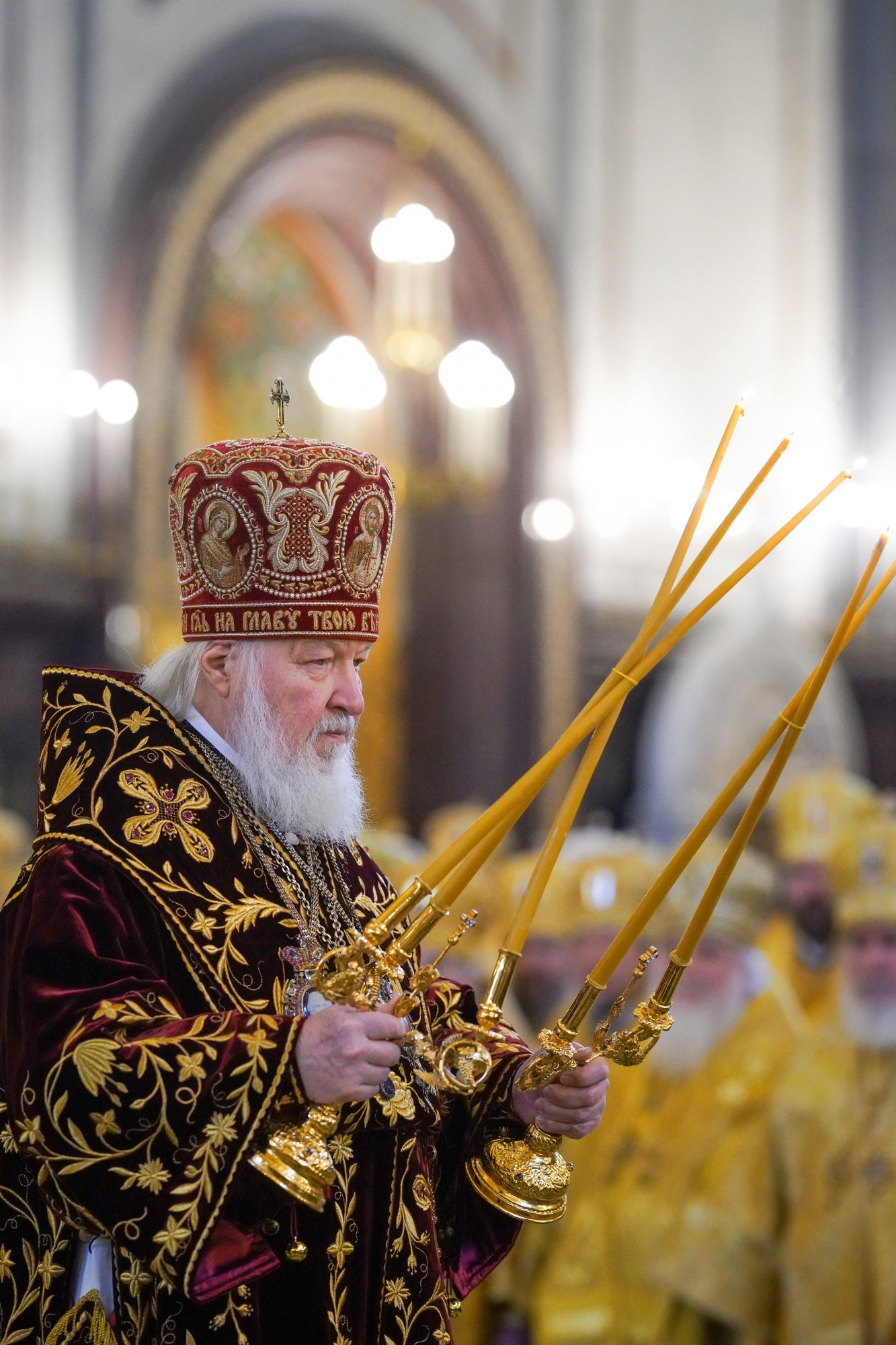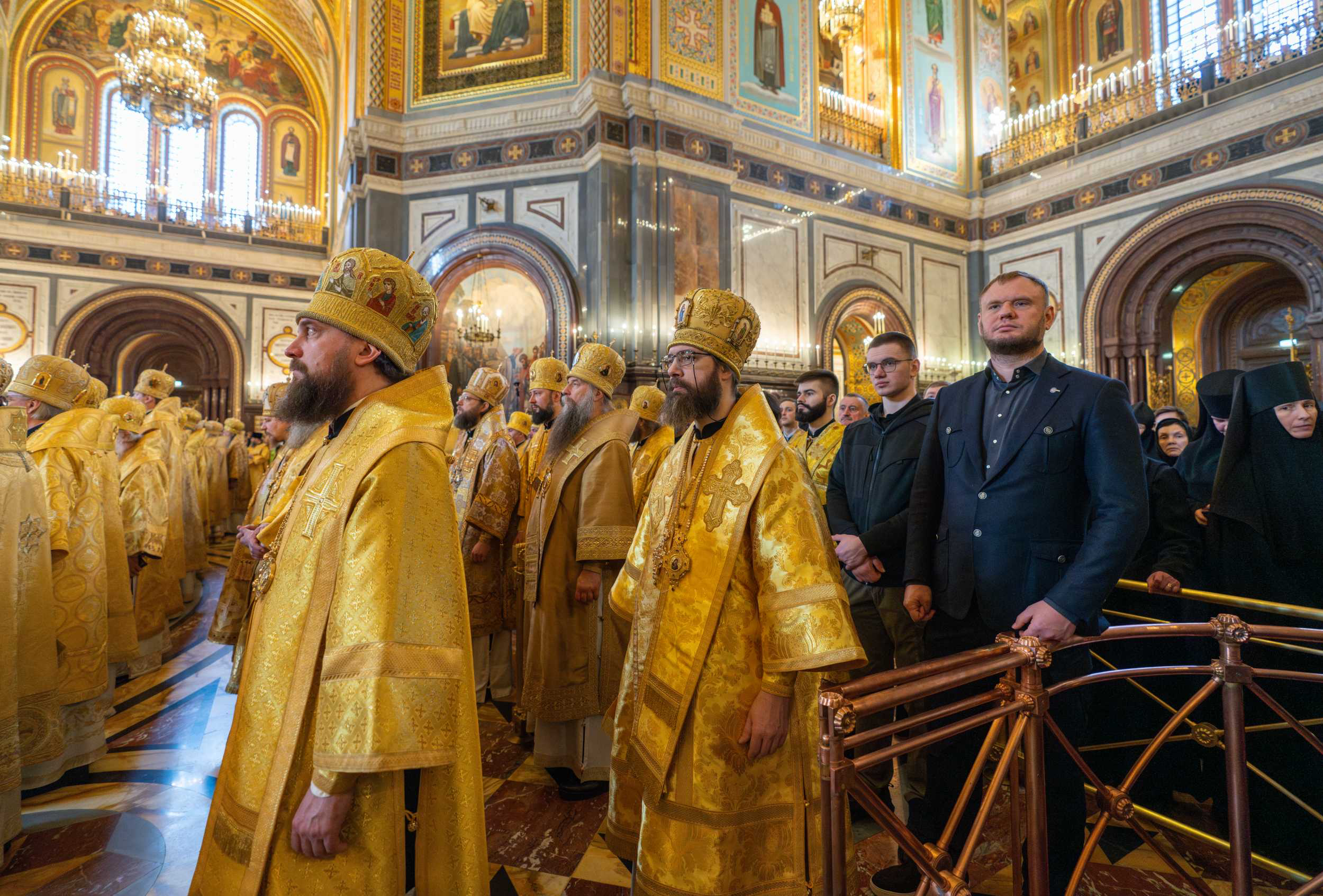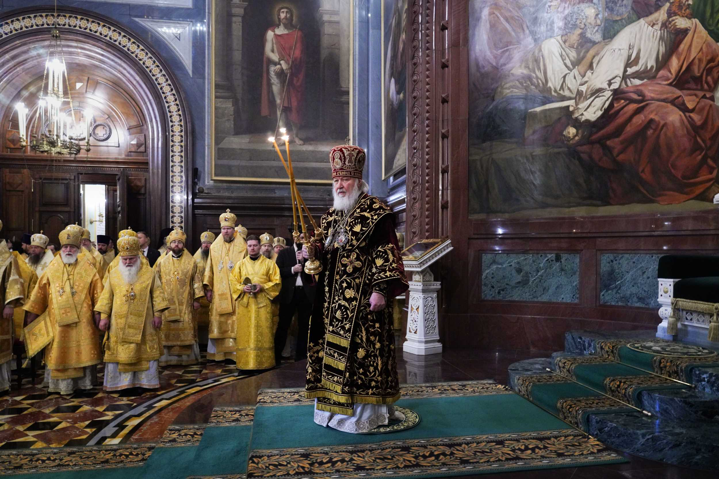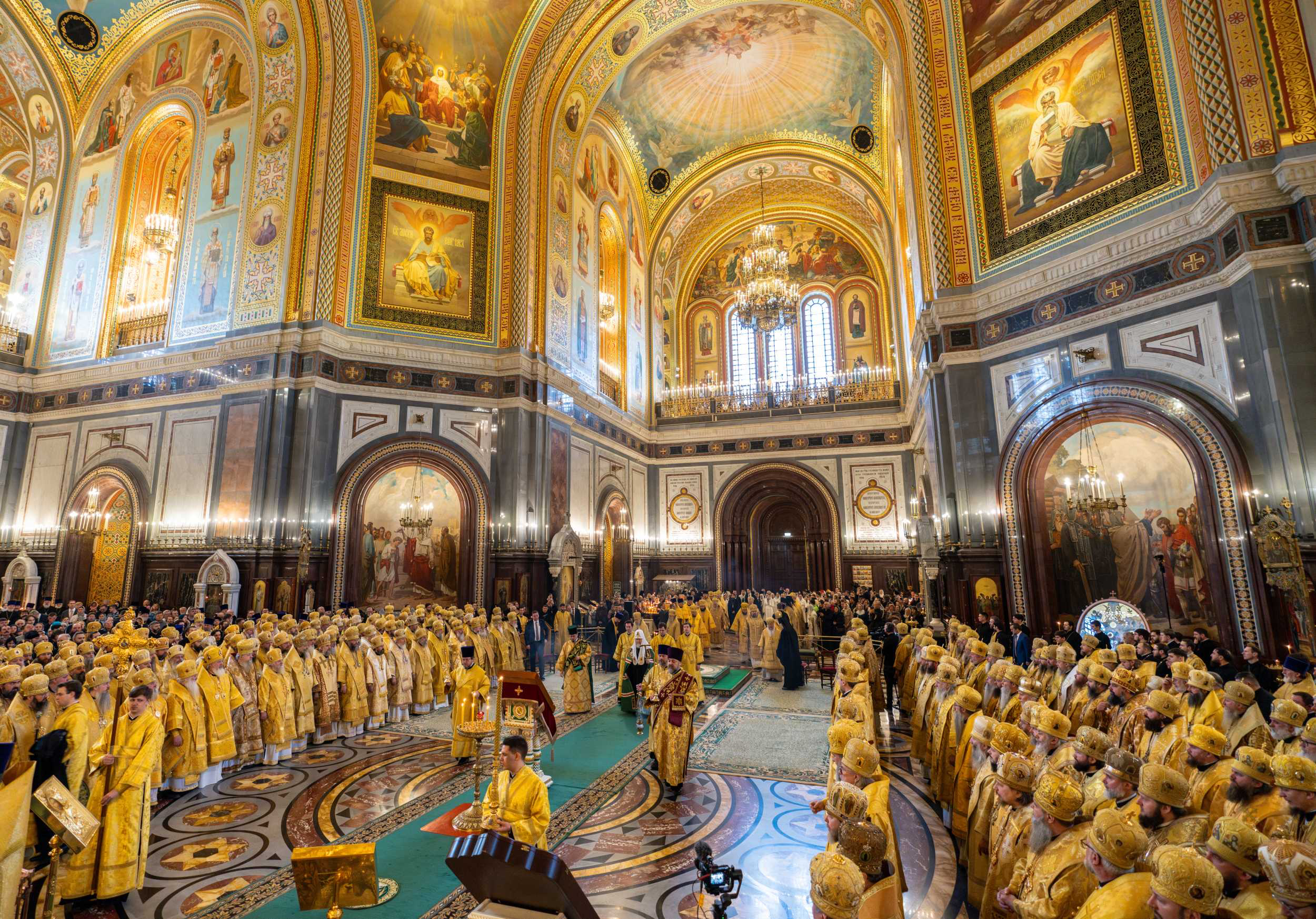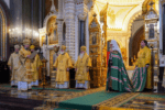 В этот знаменательный день Святейший Патриарх Кирилл совершил Божественную литургию в кафедральном соборном Храме Христа Спасителя в Москве в интронизационных облачениях и с копией жезла святителя Петра.