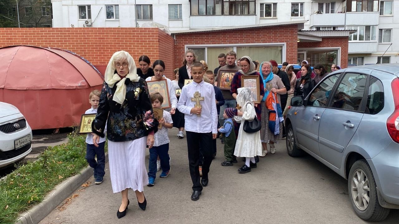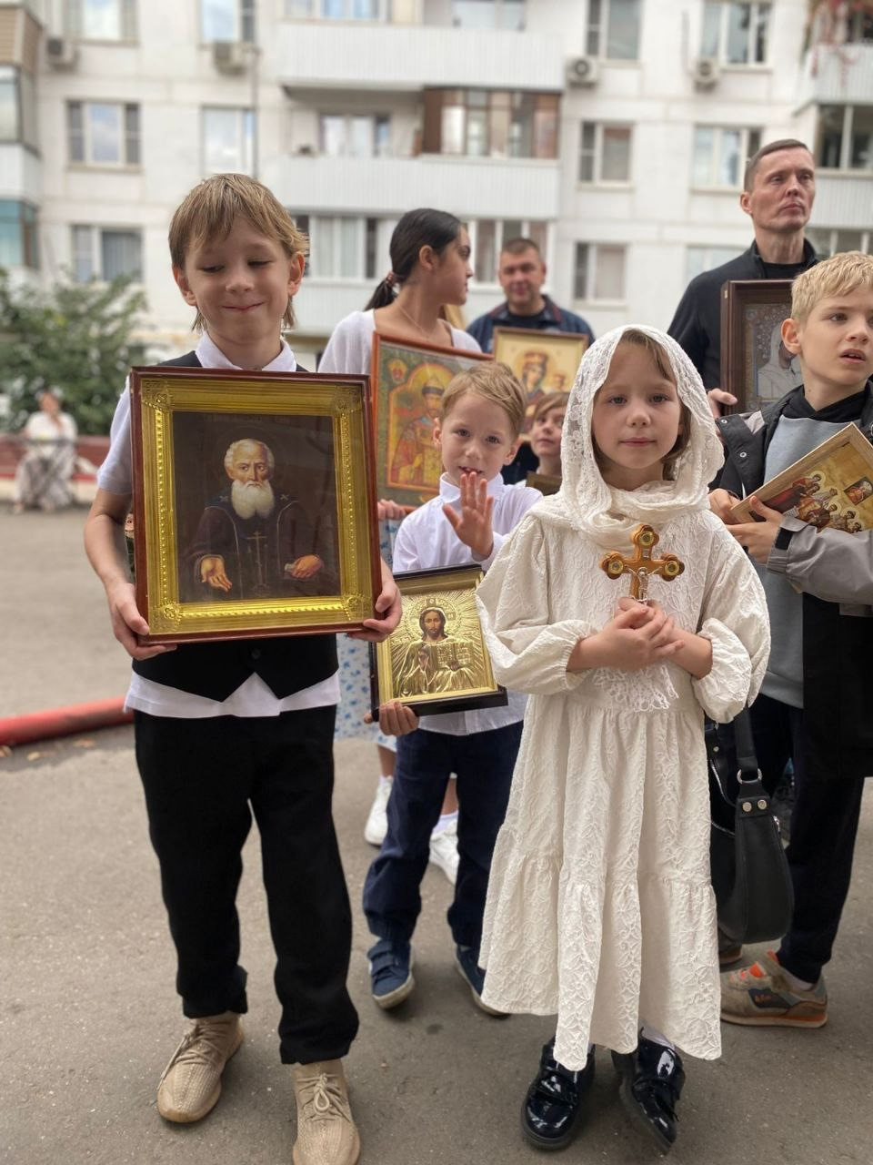 После Литургии ребята совершили детский Крестный ход вокруг храма, держа в руках иконы святых.