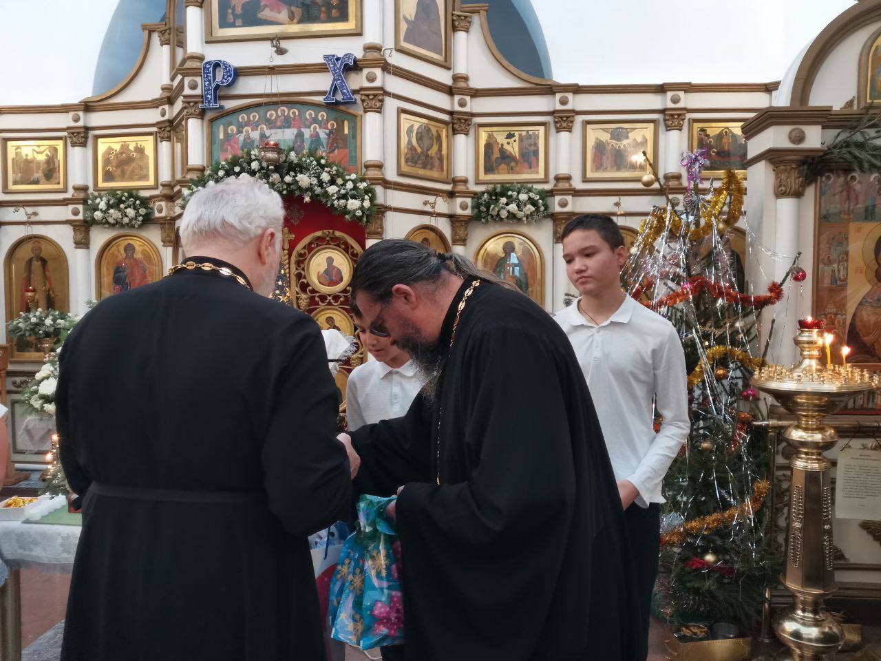 После концерта и.о. настоятеля храма иерей Виктор Зайцев и клирик храма иерей Александр Колокольчиков поздравили всех с праздником и вручили детям рождественские подарки. Затем все отправились на праздничную трапезу.