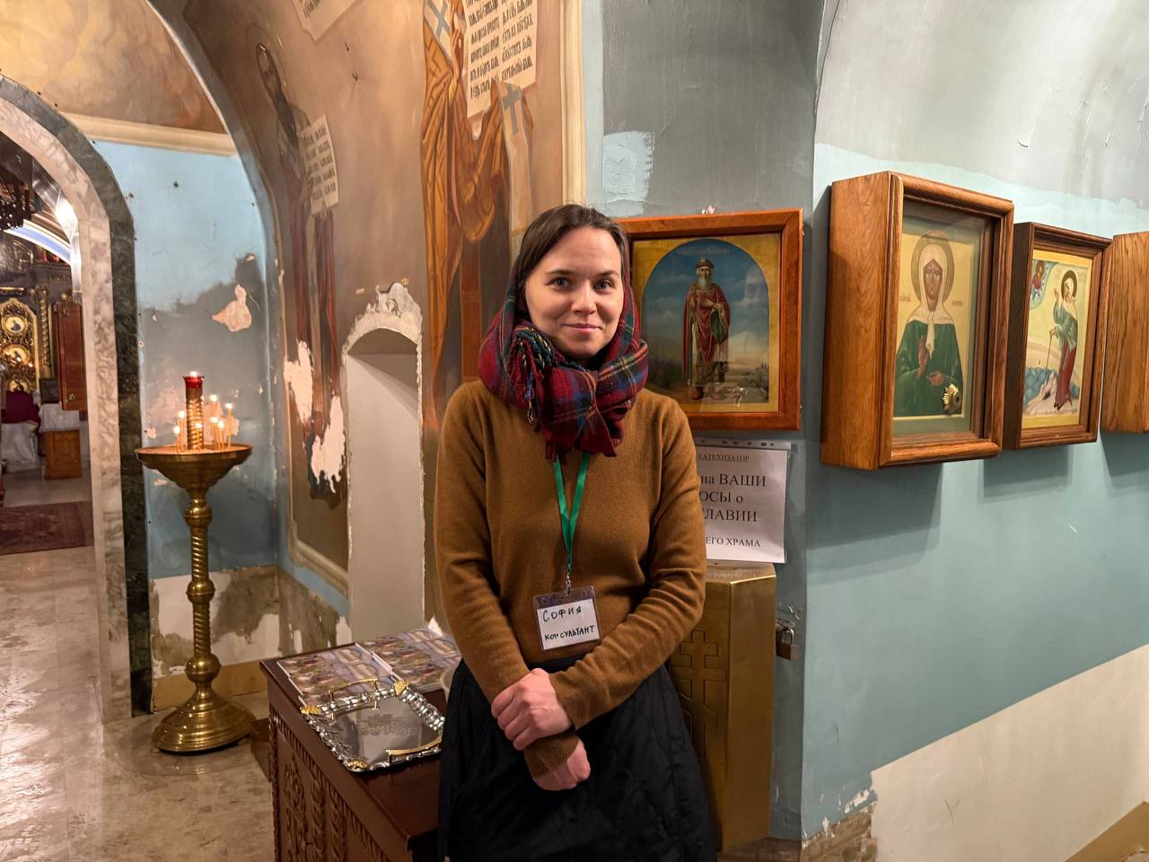 Вторая группа консультантов дежурила в притворе и у ёмкостей с крещенской водой. Добровольцы помогали людям сориентироваться, подсказывали, где находятся почитаемые иконы, и напоминали о возможности причаститься перед праздничным всенощным бдением.