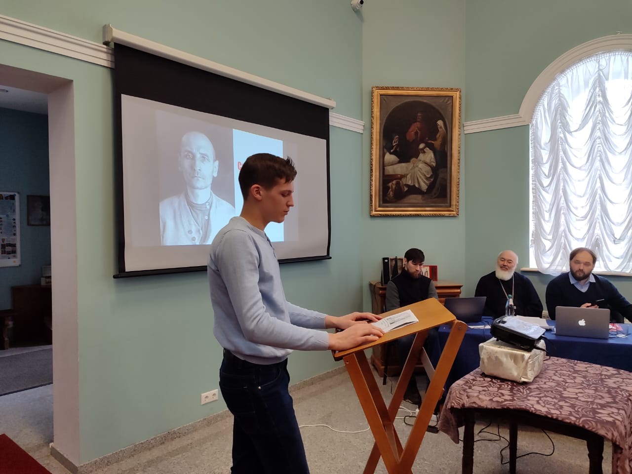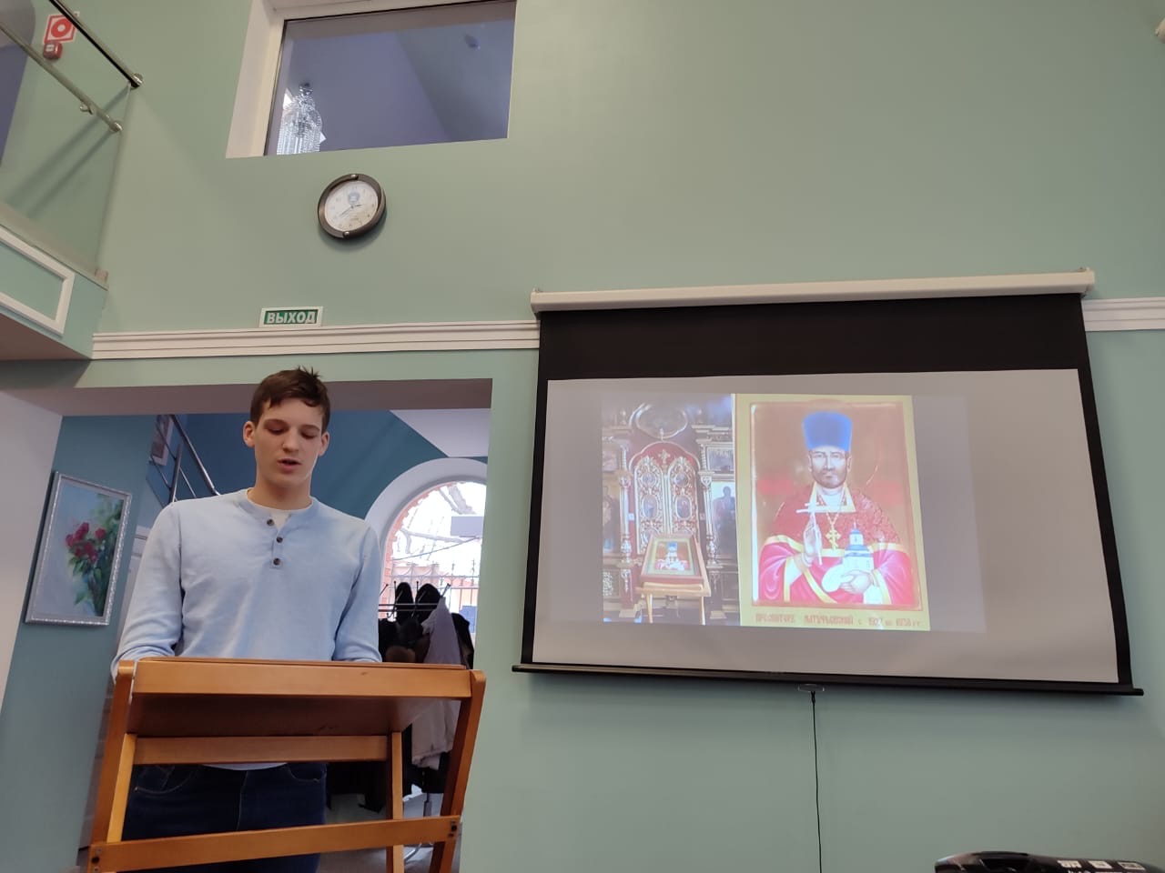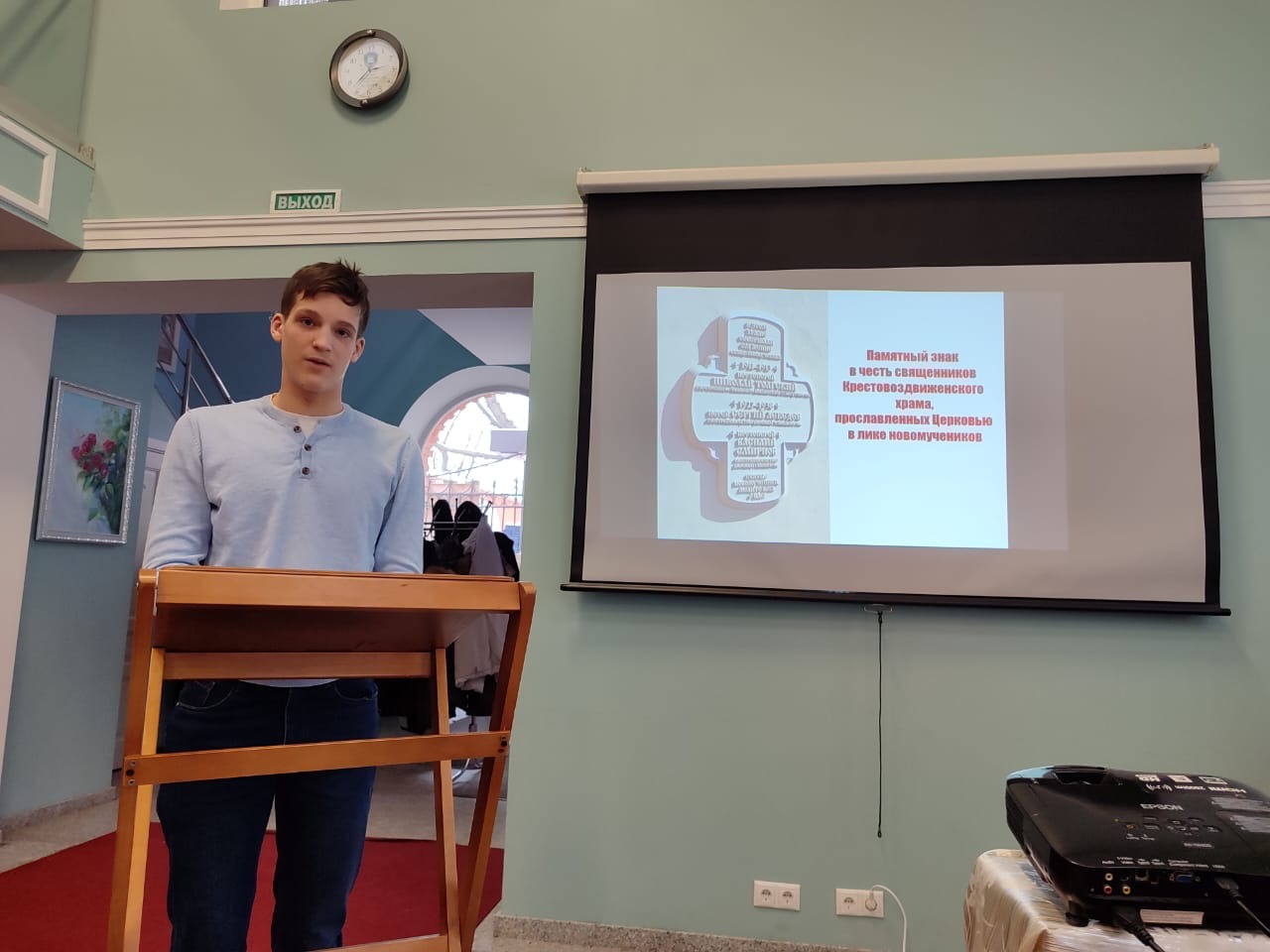 Учащийся молодёжной группы воскресной школы храма Воздвижения Креста Господня в Алтуфьеве Петр Копытько выступил с докладом о жизни священномученика Сергия Лебедева, служившего в этом храме в 20-30-х годах прошлого столетия.