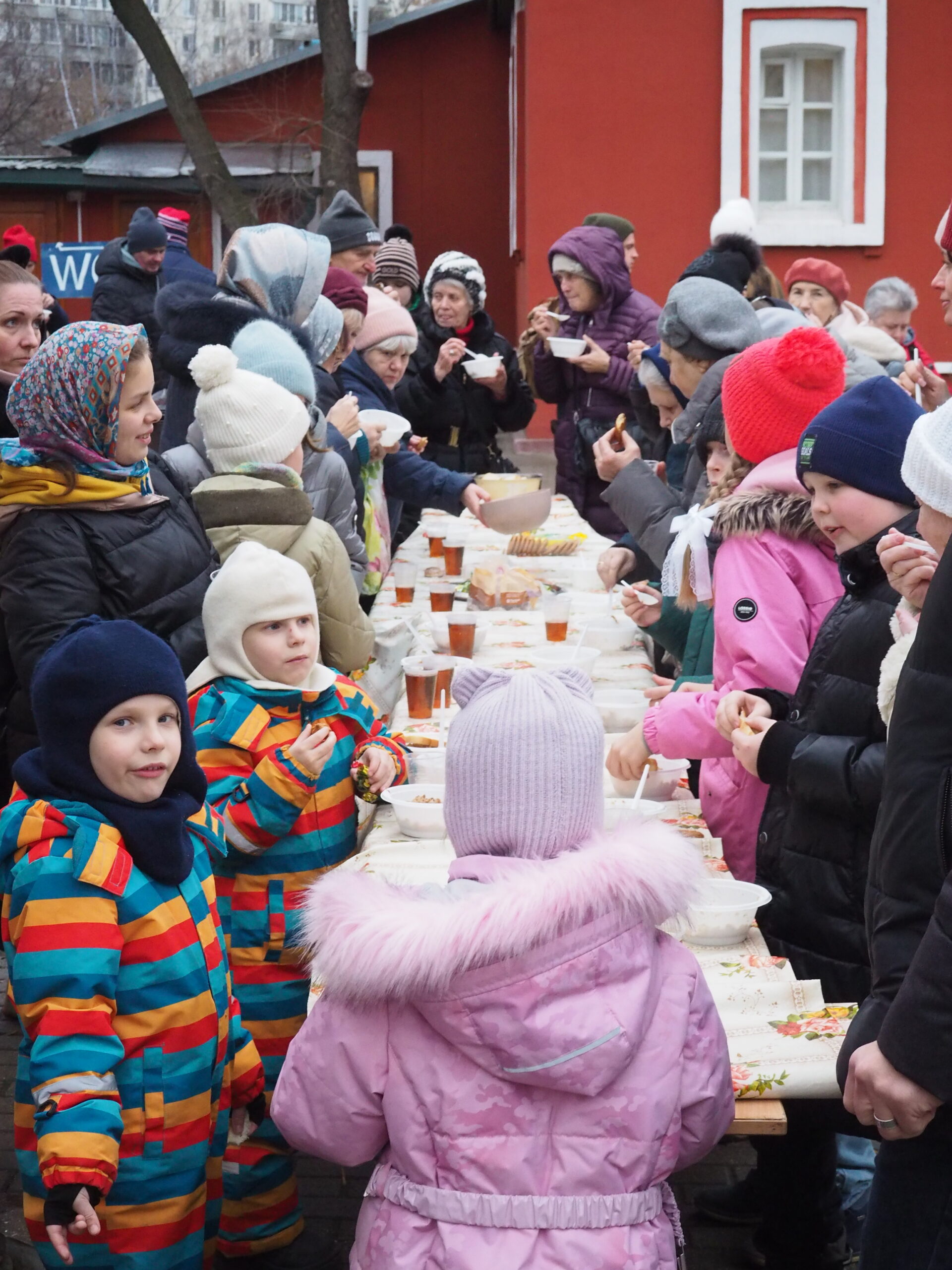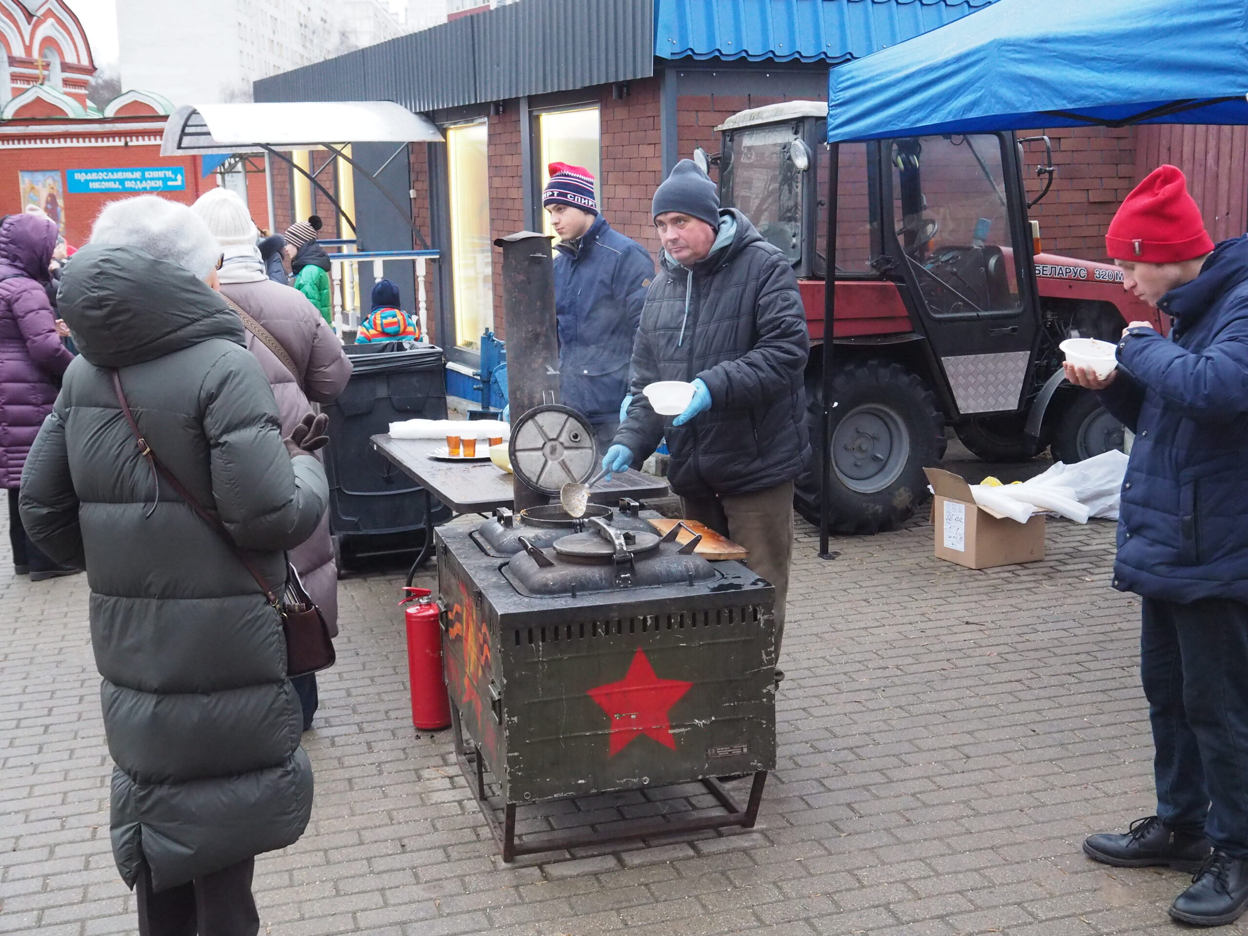 После встречи на территории храма была организована раздача «солдатской» каши и вкусного чая из полевой кухни.