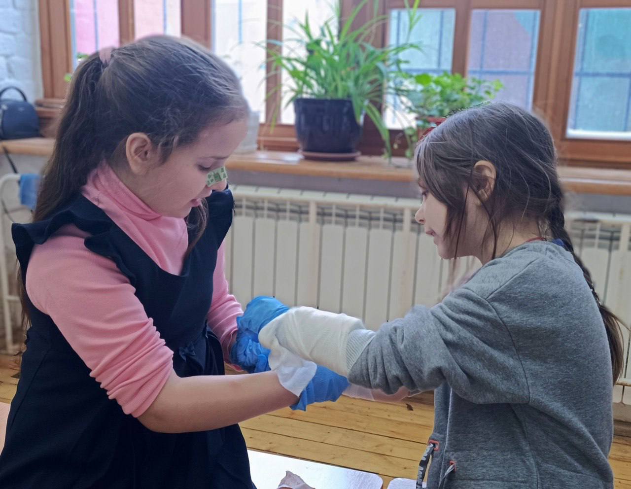 Юные участники изучали способы обработки небольших повреждений кожи (ссадины и царапины), узнали, почему важно правильно обрабатывать раны, познакомились с методами остановки кровотечения — прямым давлением на рану и наложением давящей повязки.