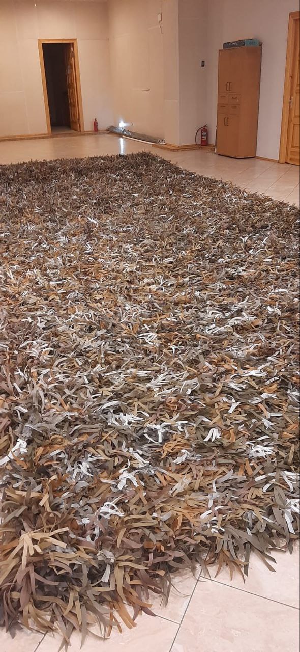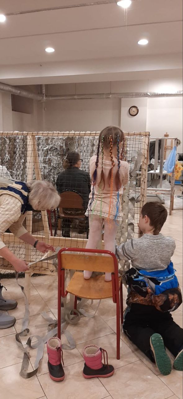 В мастерской ждут всех, кто готов присоединиться и помочь в плетении маскировочных сетей — работа найдется для всех возрастов и возможностей. Кто-то плетет сети, кто-то берет резать материал домой.