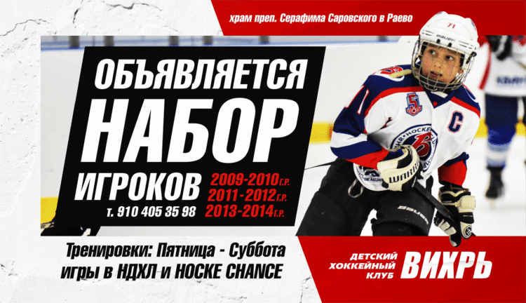 Хоккейный клуб «Вихрь» прекрасная возможность для ребят, кто хочет совместить профессиональную хоккейную подготовку и полноценную учебу в школе. Тренировки проходят два раза в неделю по пятницам и субботам (1,5 часа). По воскресеньям, два раза в месяц, проводятся игры в детских хоккейных лигах Москвы — «НДХЛ» и «ХОККЕЙ ШАНС».