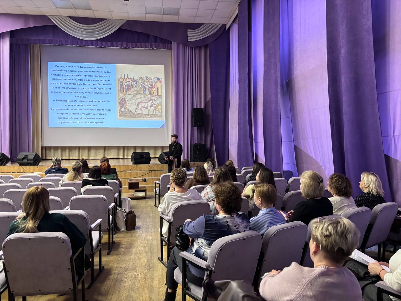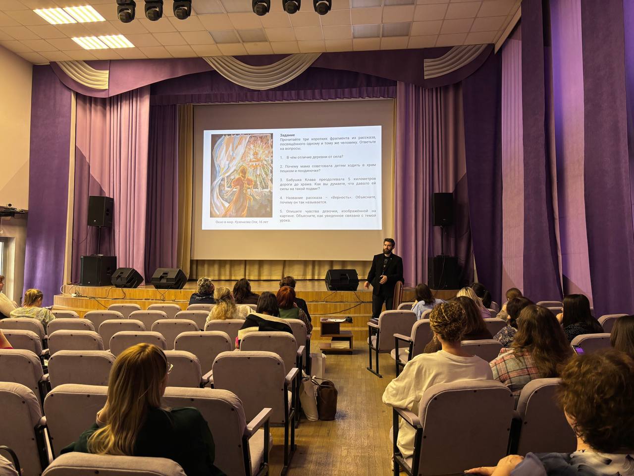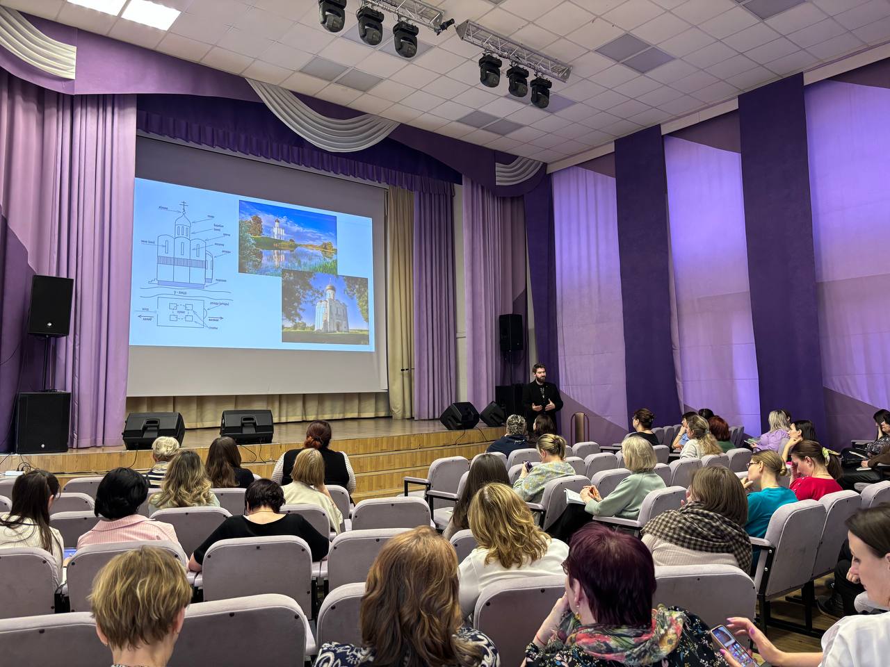 96 слушателей курса — преподающие или готовящиеся к преподаванию учебного модуля ОПК в рамках предметной области «Основы религиозных культур и светской этики» в общеобразовательных школах столицы, собрались на лекции по теме «Культура и искусство Православия», на котором ознакомились с основными методическими принципами преподавания ОПК, а также рассмотрели варианты заданий для уроков по темам «Храмы России» и «Икона».