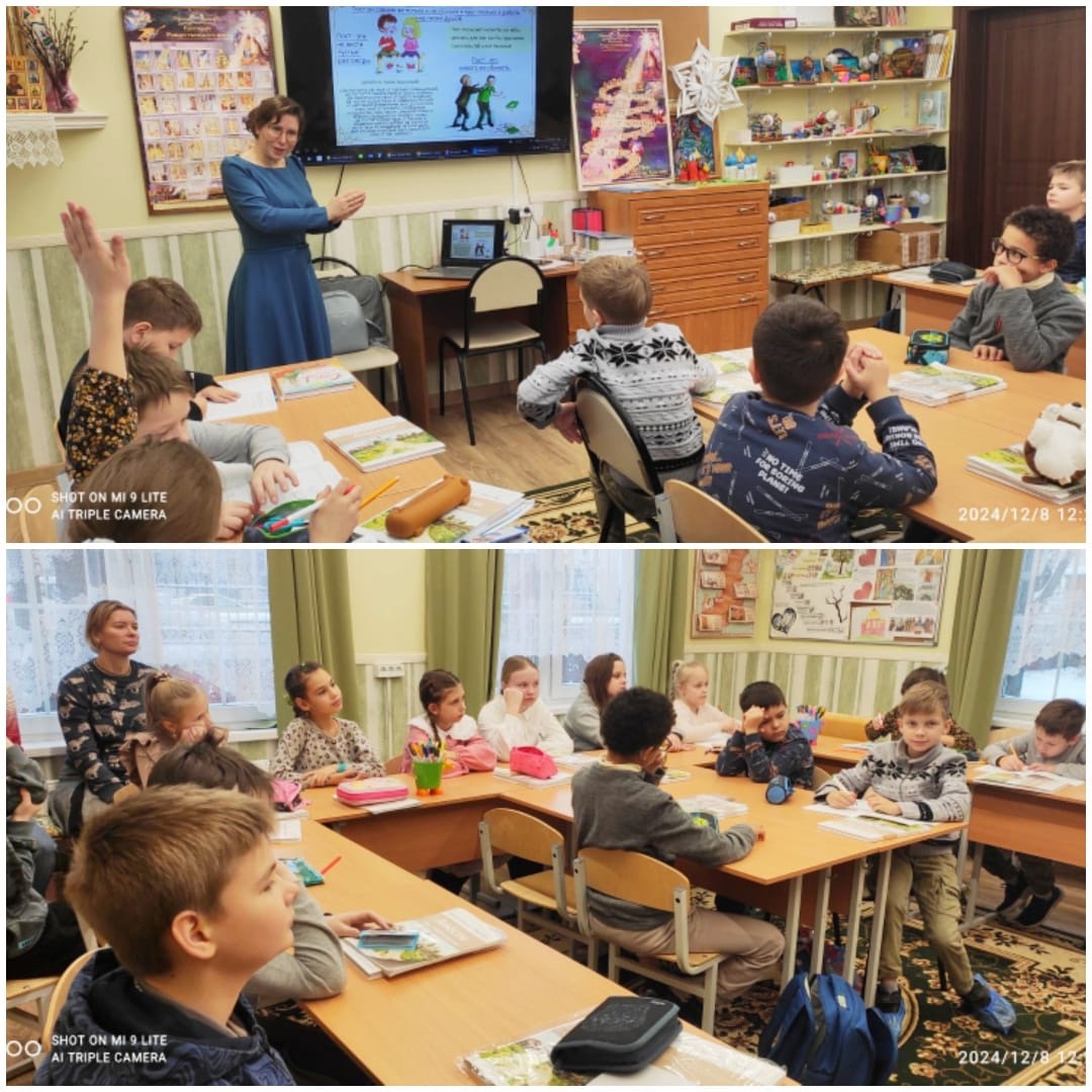 Младшие ученики Воскресной школы на прошедшей неделе беседовали с преподавателем Риммой Юрьевной о празднике Введения во храм Пресвятой Богородицы; размышляли о том, что такое настоящая радость для души, а еще учили колядки к Рождеству.