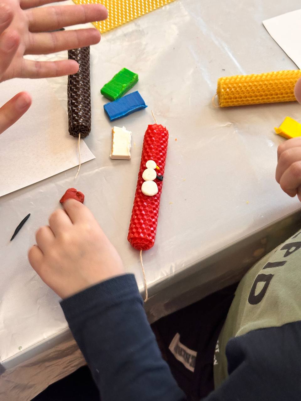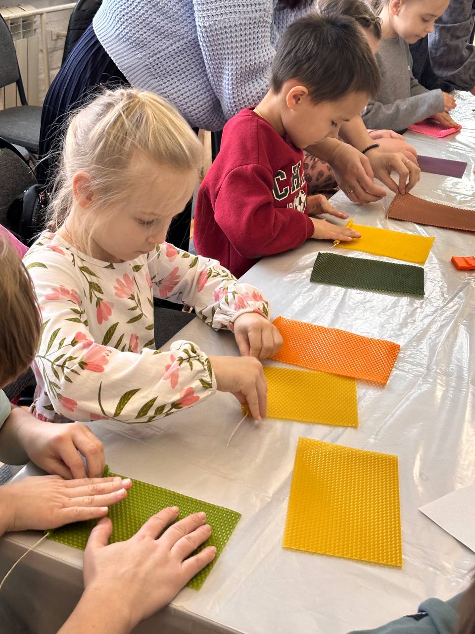 Ребятам предложили создать уникальные свечи, используя натуральные материалы — тонкие разноцветные восковые листы, называемые вощиной. Вощина – это созданная человеком из натурального воска основа для пчелиных сот. Соты для пчел делаются на ней специальным прессом. Это полностью натуральный продукт. Из него изготавливаются соты, в которых хранится мед.