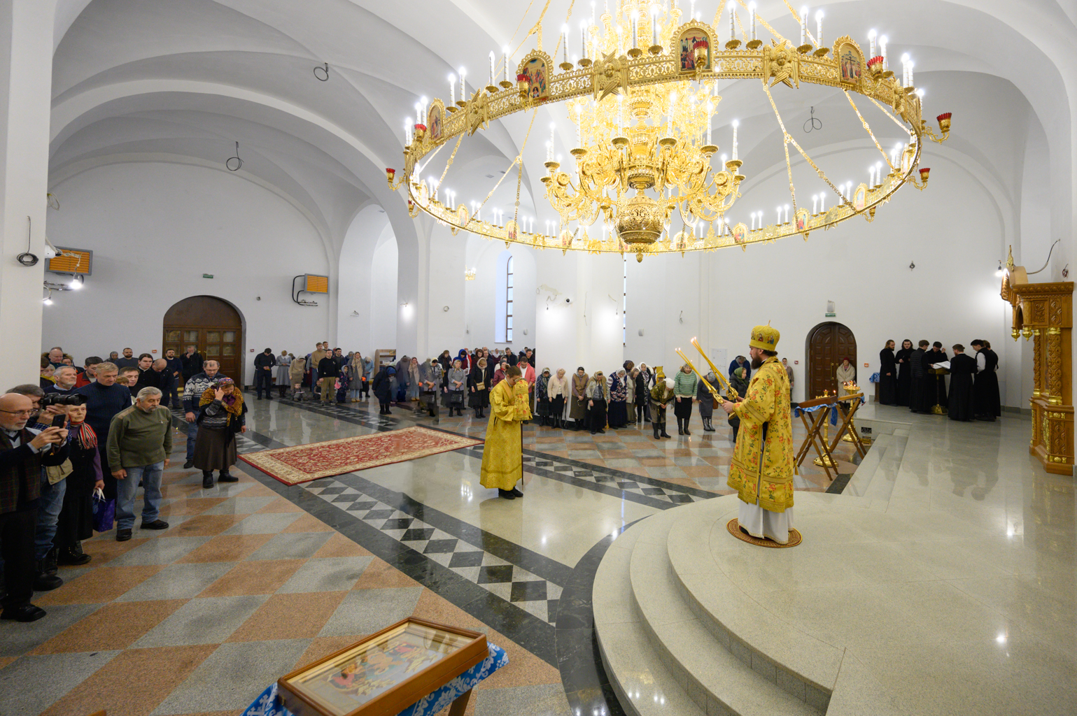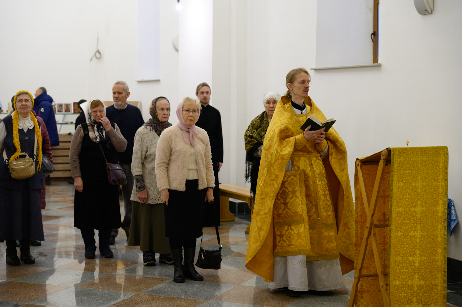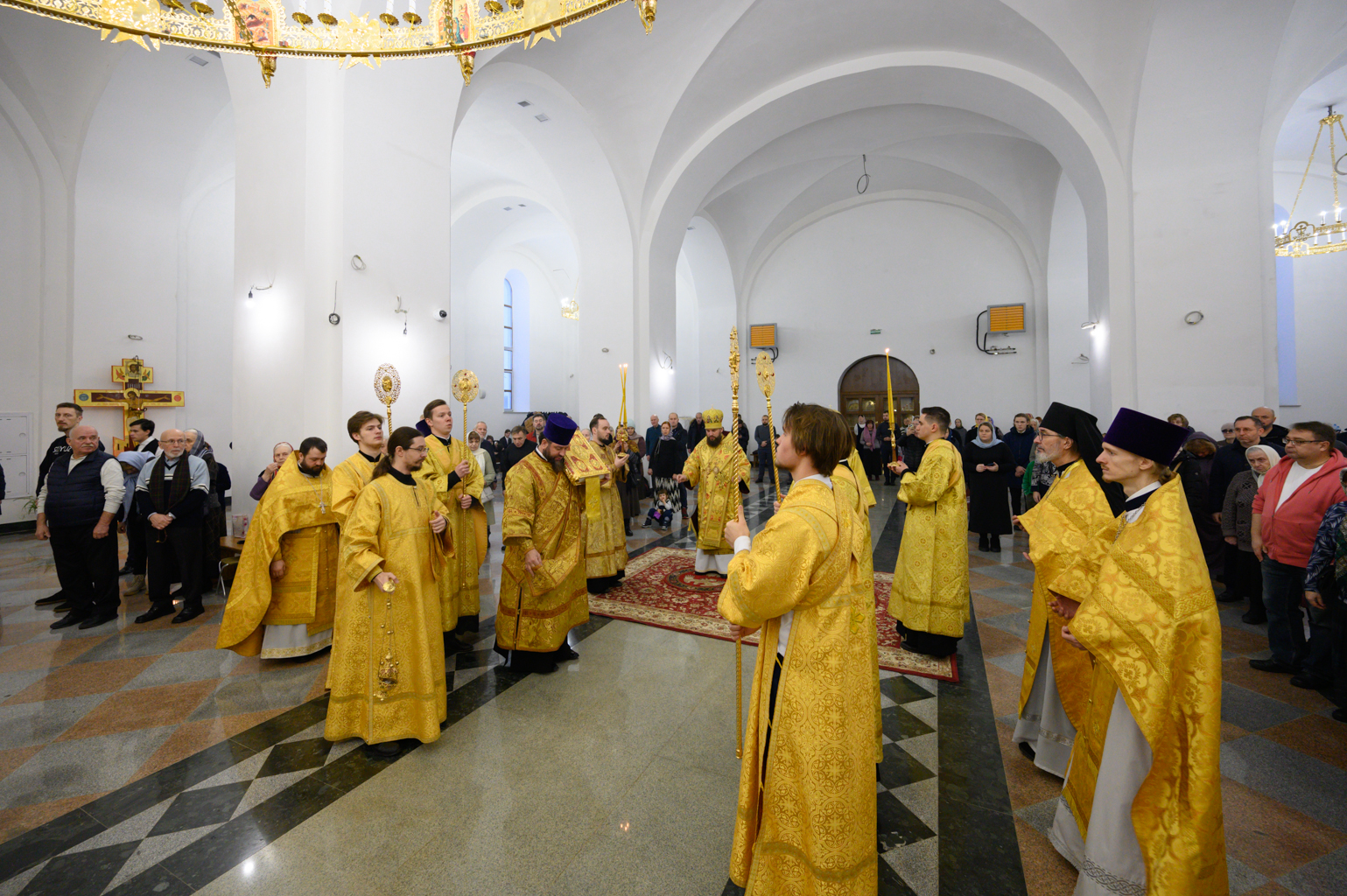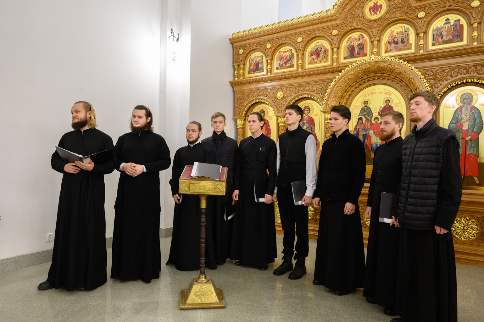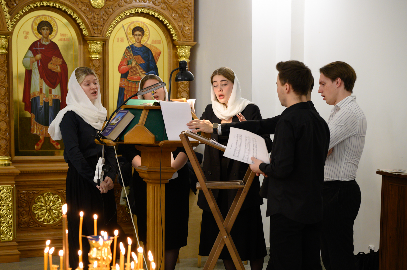 Богослужебные песнопения исполнили хор храма Живоначальной Троицы в Усадьбе Свиблово под управлением регента Марии Герего и хор Псково-Печерской духовной семинарии под управлением регента Максима Давыдова.
