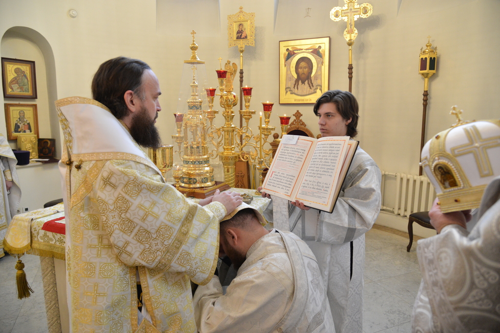 За Божественной литургией митрополит Арсений совершил диаконскую хиротонию алтарника подворья Патриарха Московского и всея Руси при храме святителя Николая Мирликийского в Отрадном города Москвы чтеца Серафима Киреева.