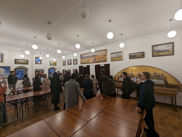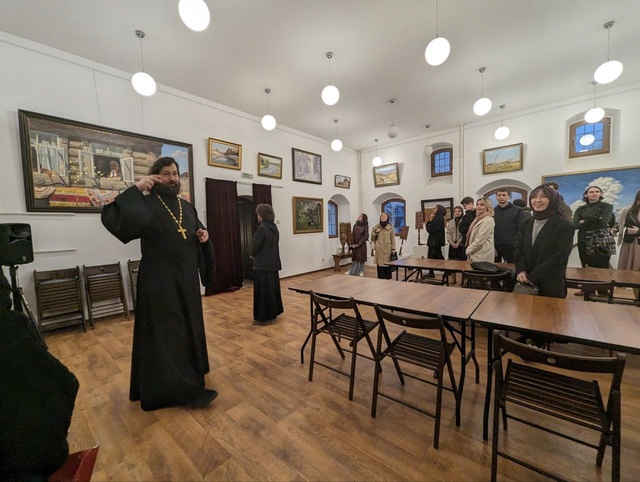 Затем молодежь пригласили в приходской дом, построенный по технологиям XVII века, показали приходскую выставку картин «Русский Север» и угостили чаем с пирожками. Во время трапезы настоятель рассказал ребятам несколько замечательных историй, связанных с проектом «Общее дело. Возрождение деревянных храмов Севера».