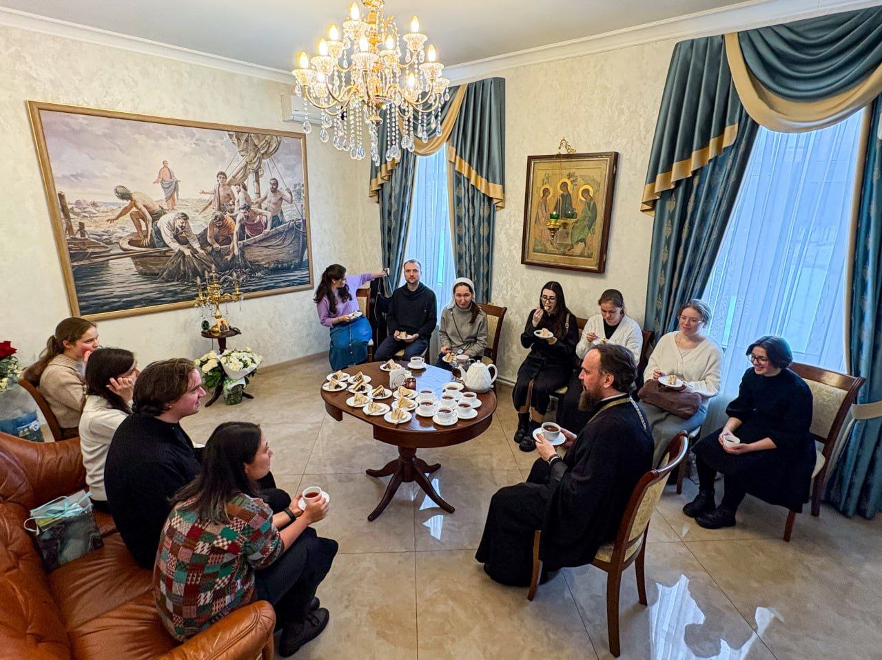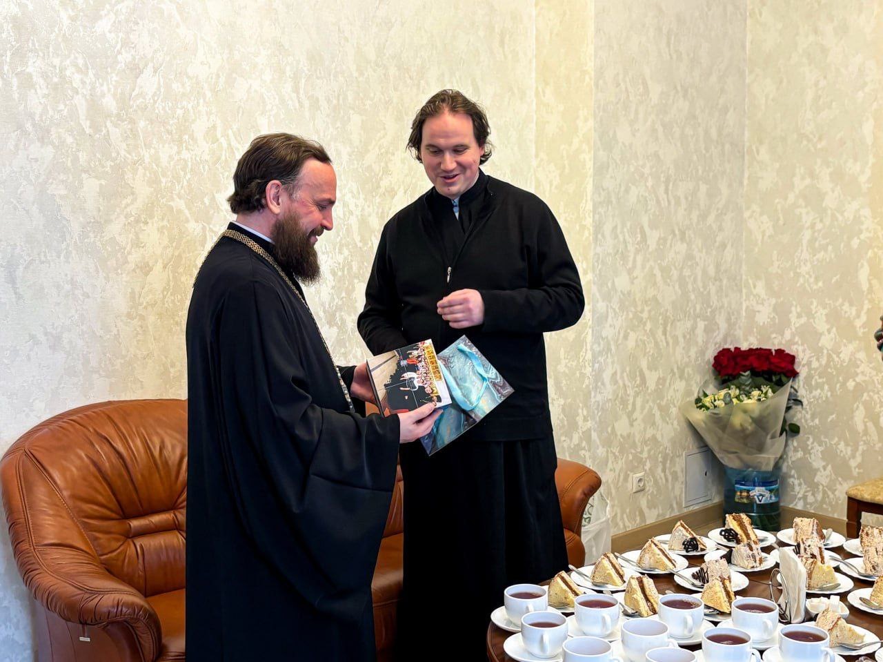 Встреча за чаем с угощением прошла в дружеской обстановке. Было сказано много добрых слов и поздравлений в адрес владыки. Каждый из присутствующих имел возможность задать митрополиту Арсению вопрос.