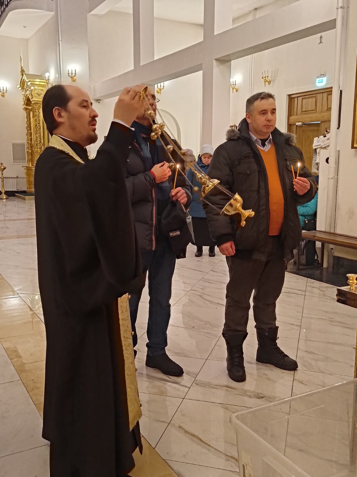В Луганской республике, выполняя свою работу, погибли журналисты Евгений Половодов, Игорь Корнелюк, Антон Микужис, Валерий Кожин, Антон Волошин. Присутствовавшие написали записки, поставили свечи на канун, вручили отцу Александру после службы памятные подарки из Луганска.