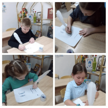 «На уроках каллиграфии мы регулярно пишем чернилами и пером со стальным наконечником, но настоящие гусиные перья вызвали у детей совсем другой эмоциональный отклик, — рассказала преподаватель воскресной школы храма учителей Словенских Елена Вадимовна Гвоздева. — Теперь такими, специально обработанными перьями мы станем писать регулярно. На ближайших занятиях по каллиграфии хотим также попробовать написать некоторые буквы славянской азбуки в том изначальном виде, как ее задумали святые создатели славянской письменности».