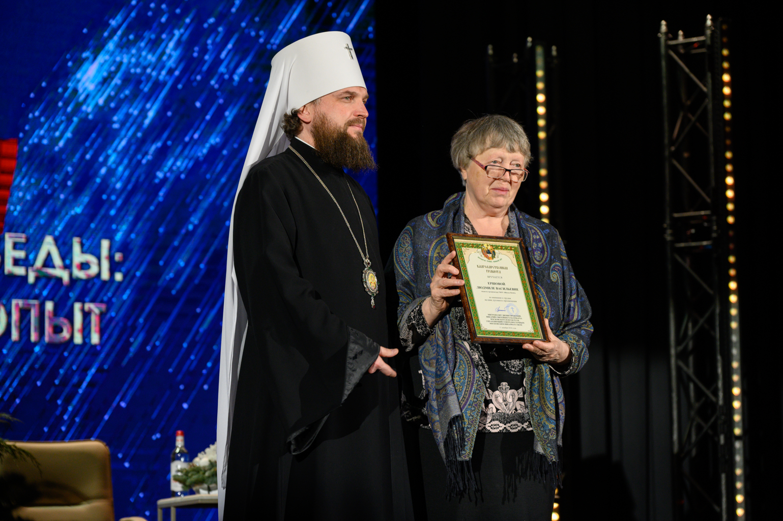 Затем управляющий Северо-Восточным Московским викариатством митрополит Звенигородский Арсений вручил церковные награды: во внимание к трудам на ниве духовного просвещения Благодарственными грамотами были отмечены педагог-организатор ГОУ Школа 1412 Людмила Васильевна Ершова и педагог-организатор ГОУ Школа 1430 Ольга Дмитриевна Зыкова.