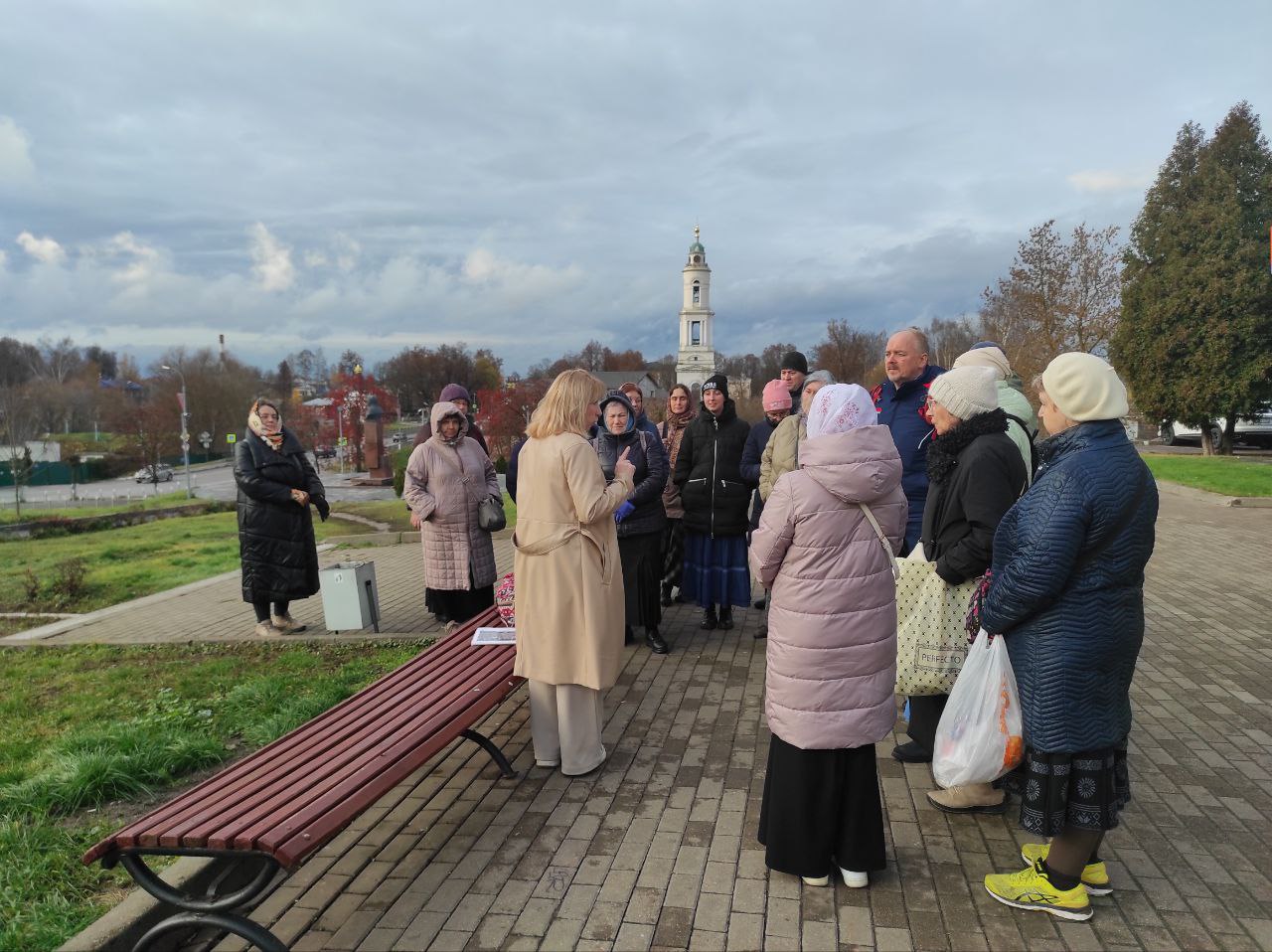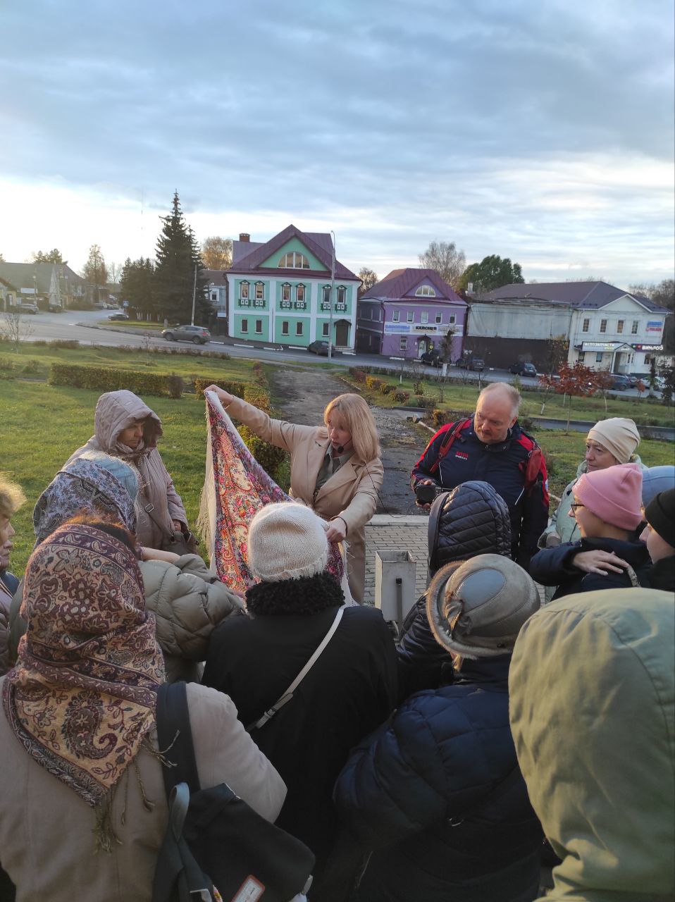 Местный краевед в ходе пешей экскурсии познакомила гостей с историей города и его знаменитых уроженцев, показала на образцах отличия настоящих павлопосадских платков от различных подделок.
