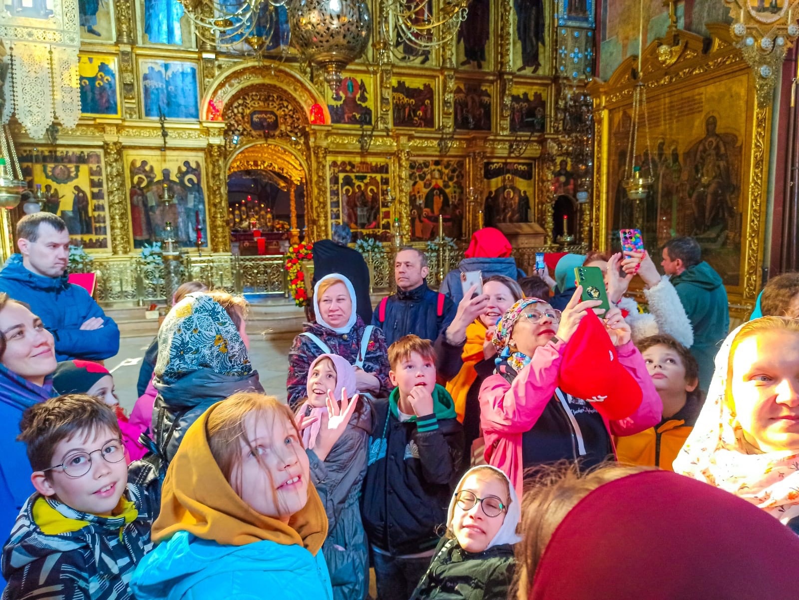 18 семей (65 человек) в сопровождении педагога, Пузовой Вероники Викторовны прошли экскурсией по монастырю, посетили святыни Лавры, помолились у мощей преподобного Сергия Радонежского и поднялись на колокольню.