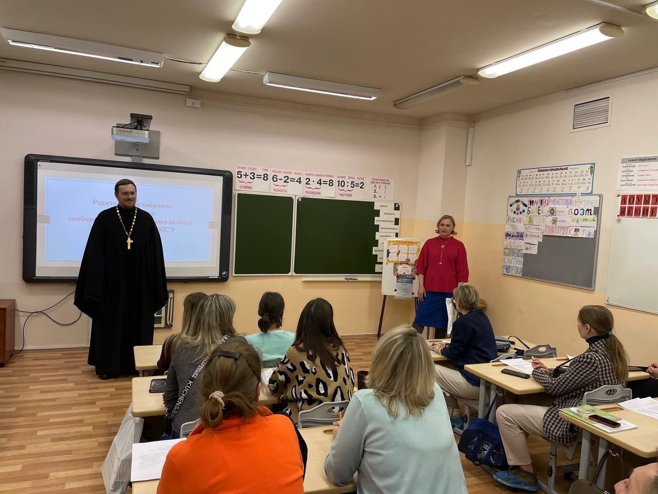 Клирик Ростокинского храма иерей Илия Козливсков и руководитель воскресной школы храма Наталья Валерьевна Мордвинова посетили собрания родителей третьеклассников общеобразовательной школы №1499 им. И.А.Докукина — в качестве общественных методистов по выбору модуля в рамках предмета «Основы религиозных культур и светской этики» (ОРКСЭ).
