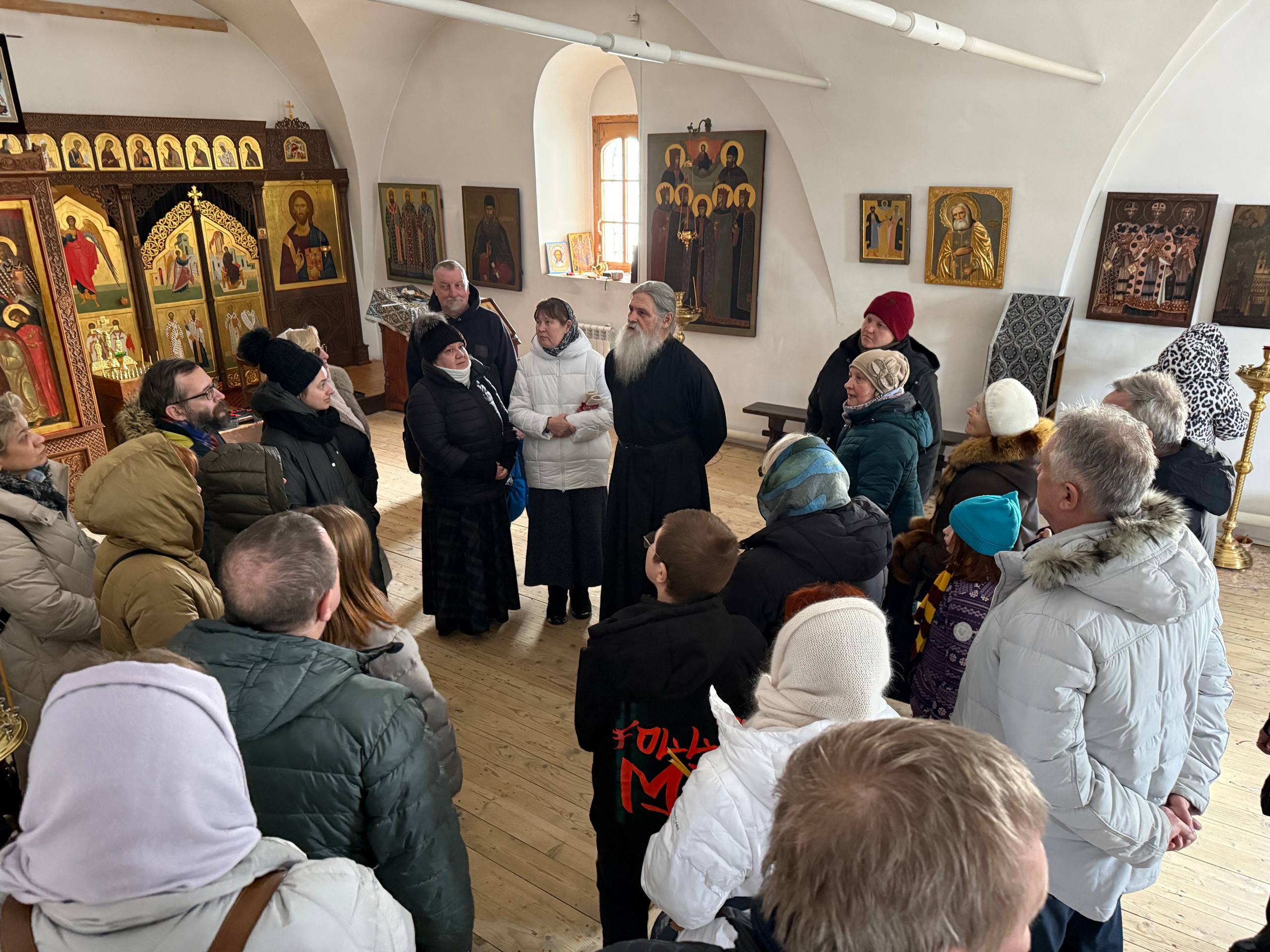 Далее богомольцы посетили Троицкий Селижаровский монастырь, основанный по преданию прп. Иосифом Волоцким. Эта обитель дала Православной Церкви святителя Гурия, первого архиепископа Казанского. Монастырь сильно пострадал в годы гонений, многие строения были разрушены, но уцелела отдельно стоящая колокольня и, главное, древний Петропавловский храм XV века, который действует сейчас как приходской. Настоятель отец Сергий рассказал об истории обители и современной истории восстановления храма.