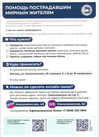 По благословению Святейшего Патриарха Кирилла продолжается сбор продуктов питания, средств гигиены и бытовой химии для пострадавших мирных жителей и беженцев из зоны проведения Специальной военной операции.
