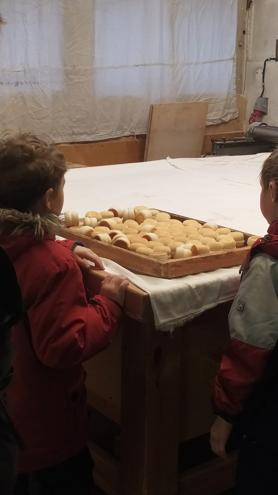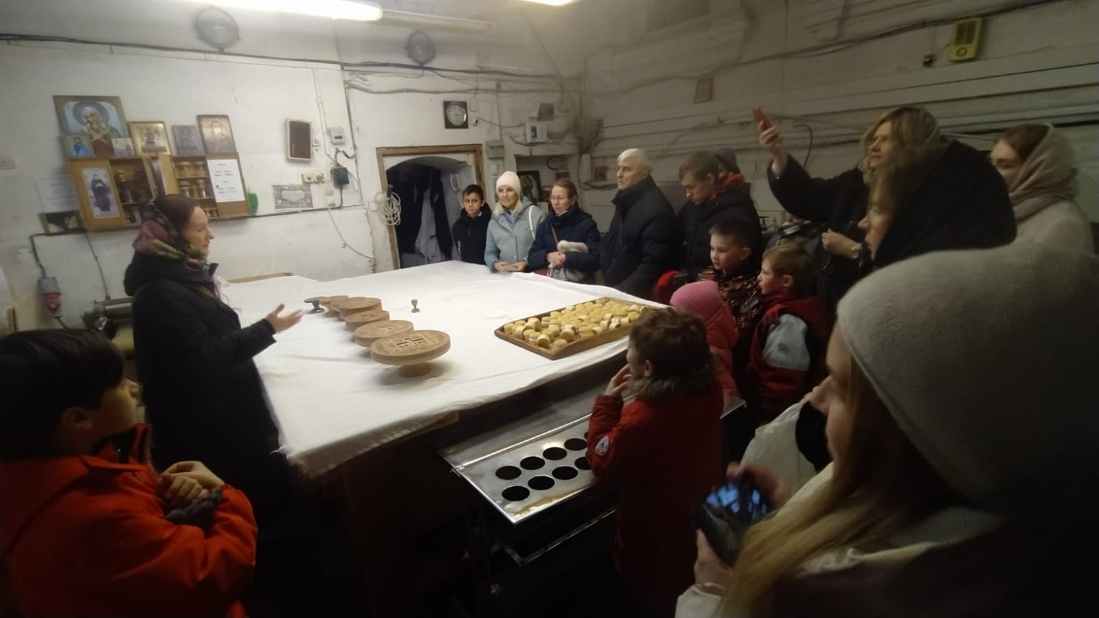 Ребят пригласили в просфорню. Они застали рабочий процесс, когда братия раскладывали верха и выпекали просфоры. Большой интерес вызвали инструменты для изготовления хлебов (печати и нарезка заготовок). Всех участников экскурсии угостили только что испеченными, еще горячими, просфорами.