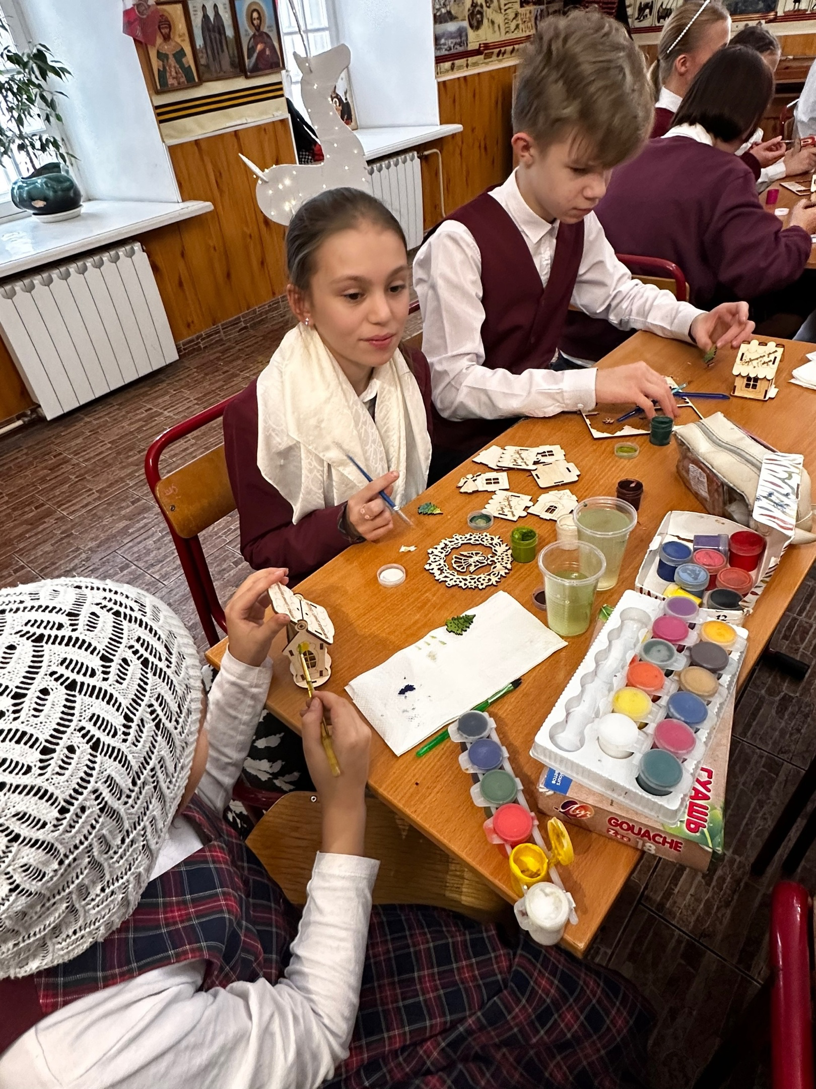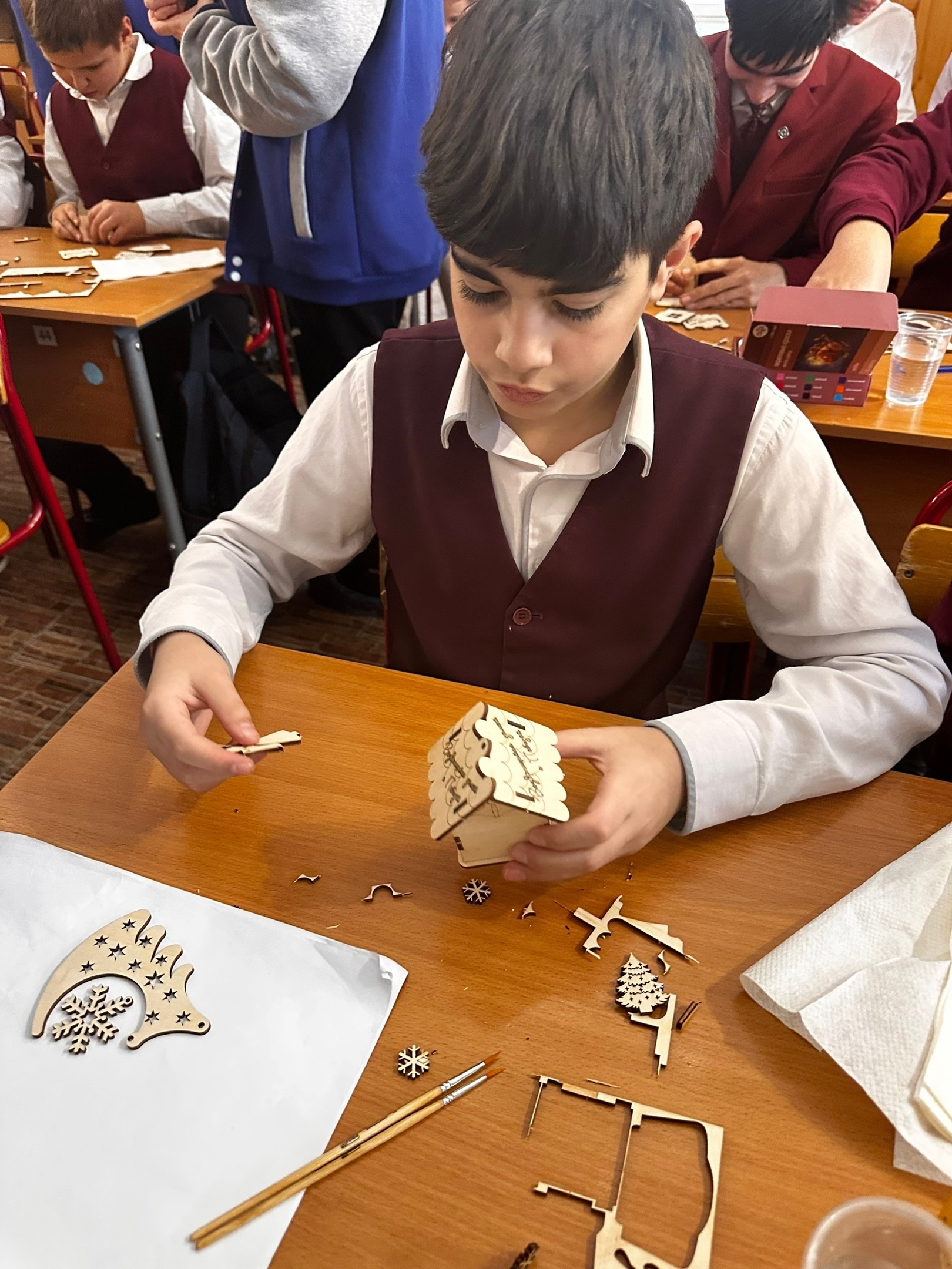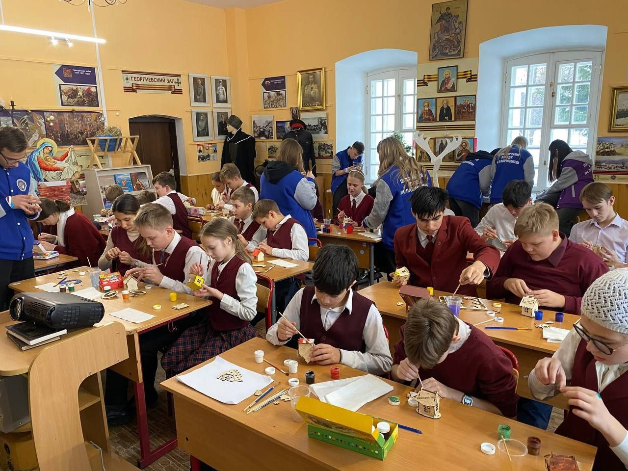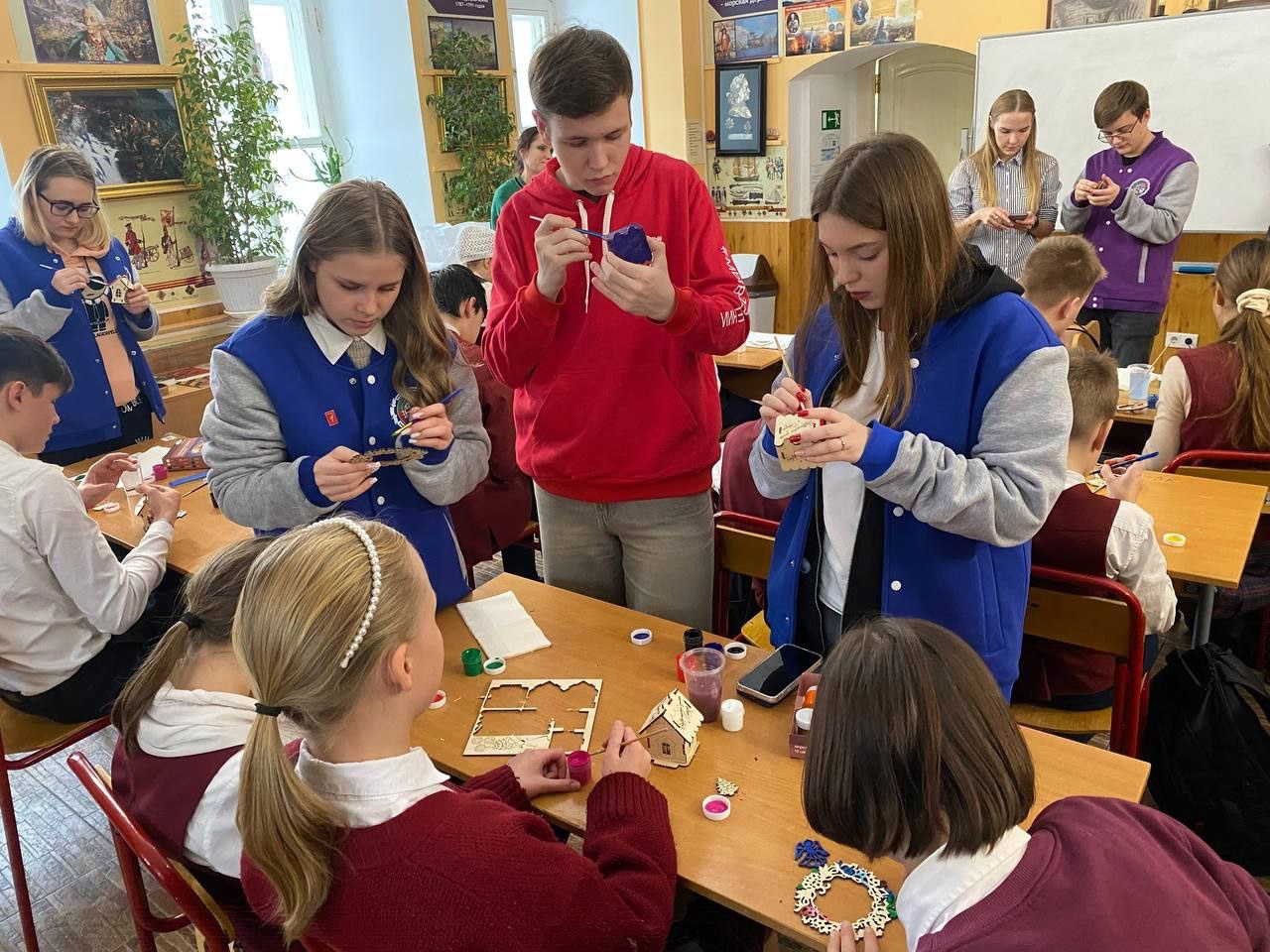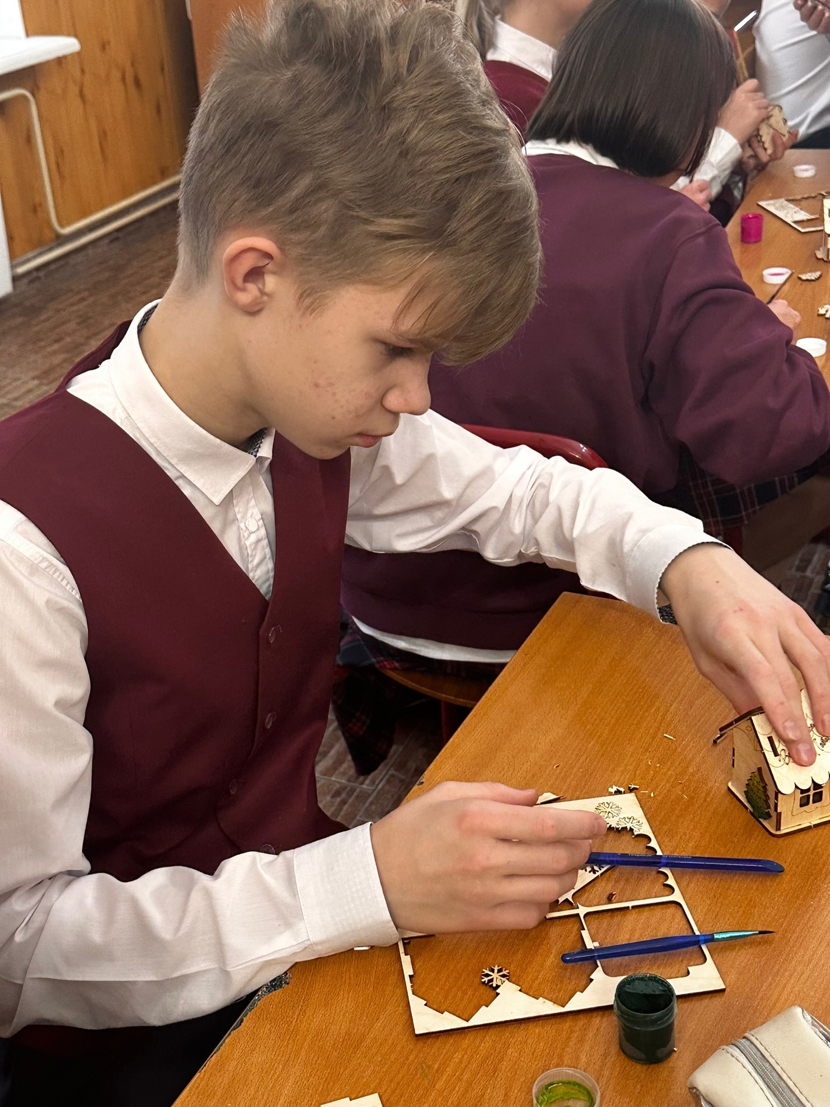 Мастер-класс для ребят провели студенты Политехнического колледжа имени П.А. Овчинникова. Они привезли заготовки для новогодних украшений — деревянные домики и ёлочные игрушки.