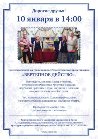10 января 2026 года в 14:00 на территории выставочно-просветительского центра при храме преподобного Серафима Саровского в Раево (проезд Шокальского д.48, 3 этаж) состоится традиционное Рождественское представление «Вертепное действо».